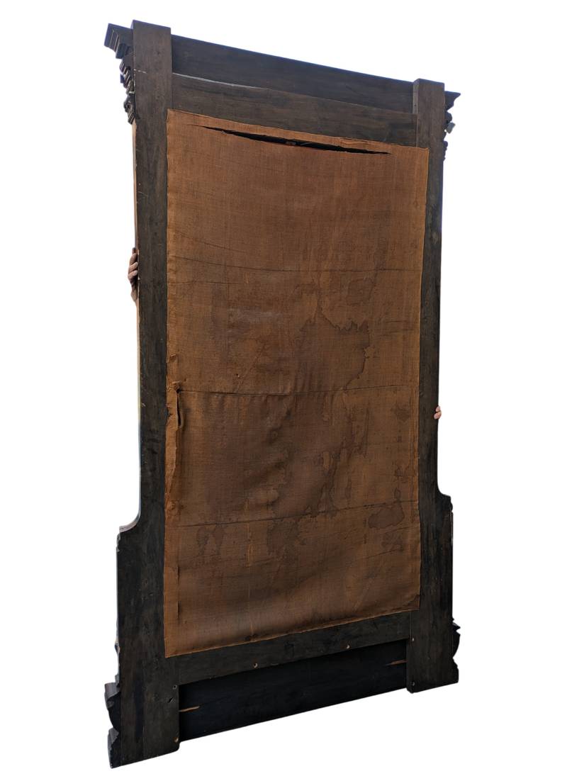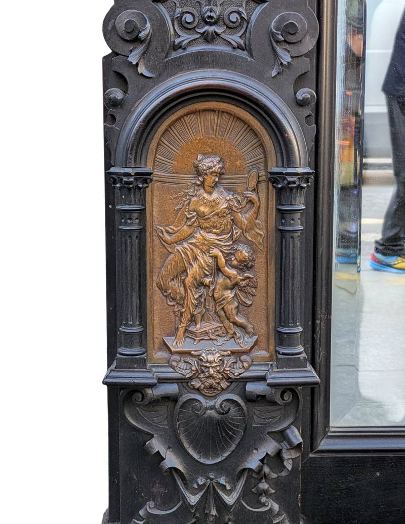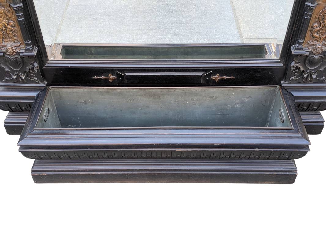 Grande specchiera da terra in legno ebanizzato con fioriera della fine del XIX / inizio XX secolo.