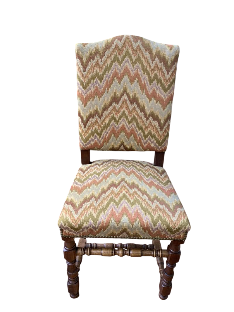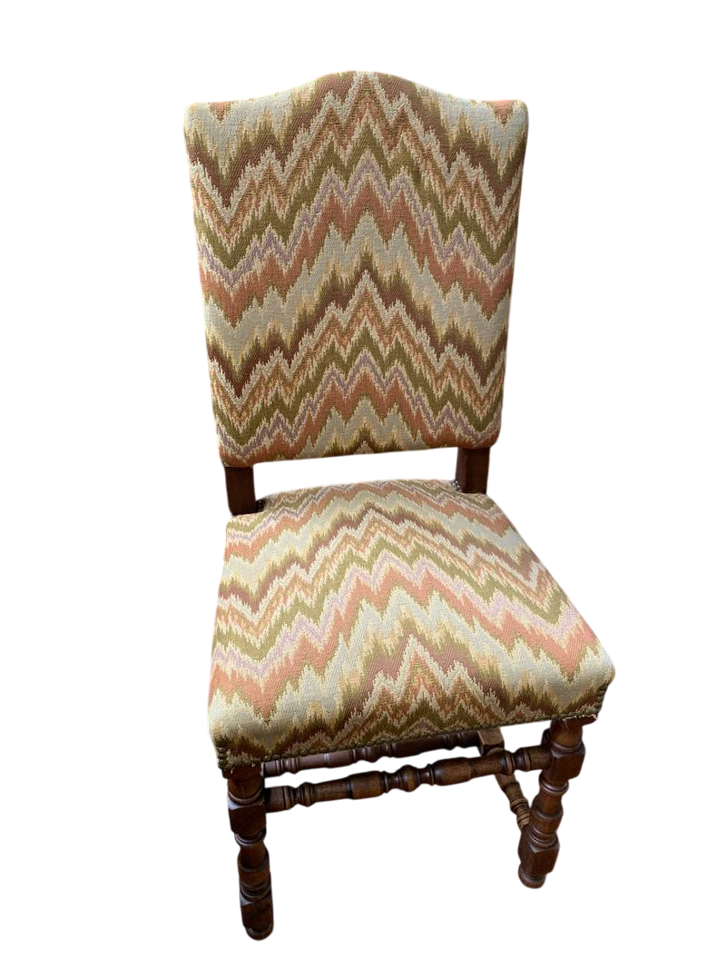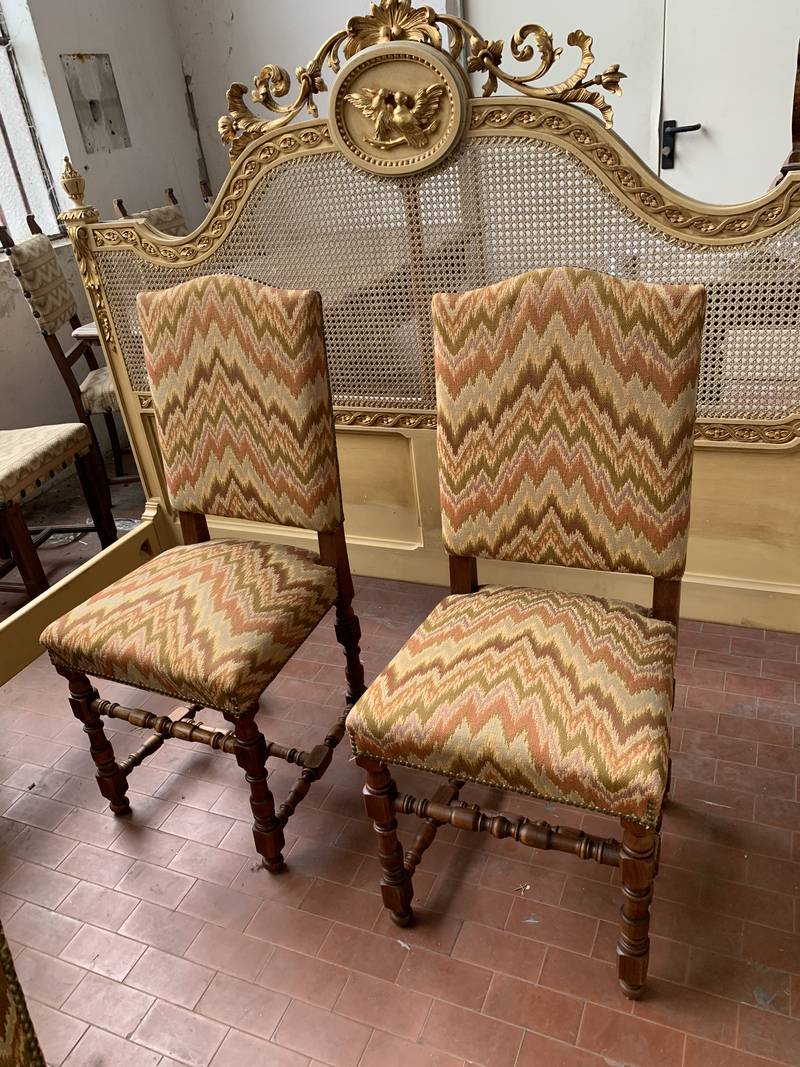 Gruppo di 4 antiche sedie imbottite con tessuto fiammato gambe tornite, epoca prima meta’ del XX secolo, in eccellenti condizioni conservative.