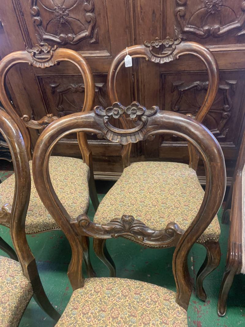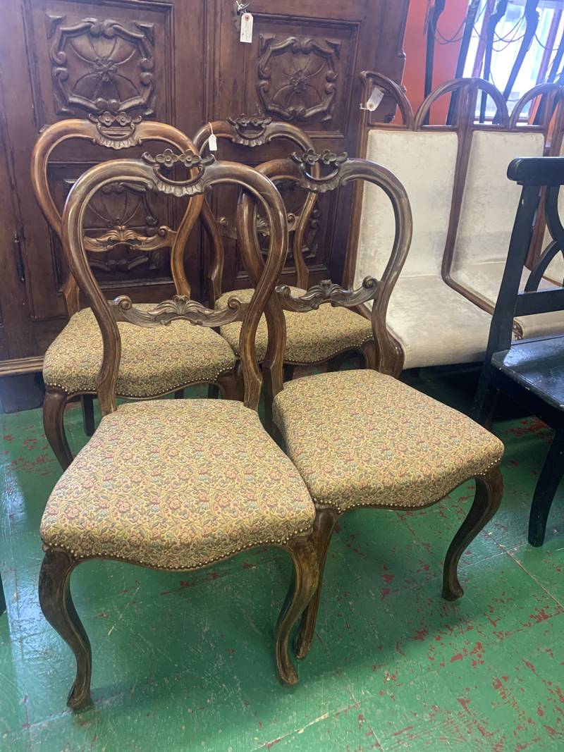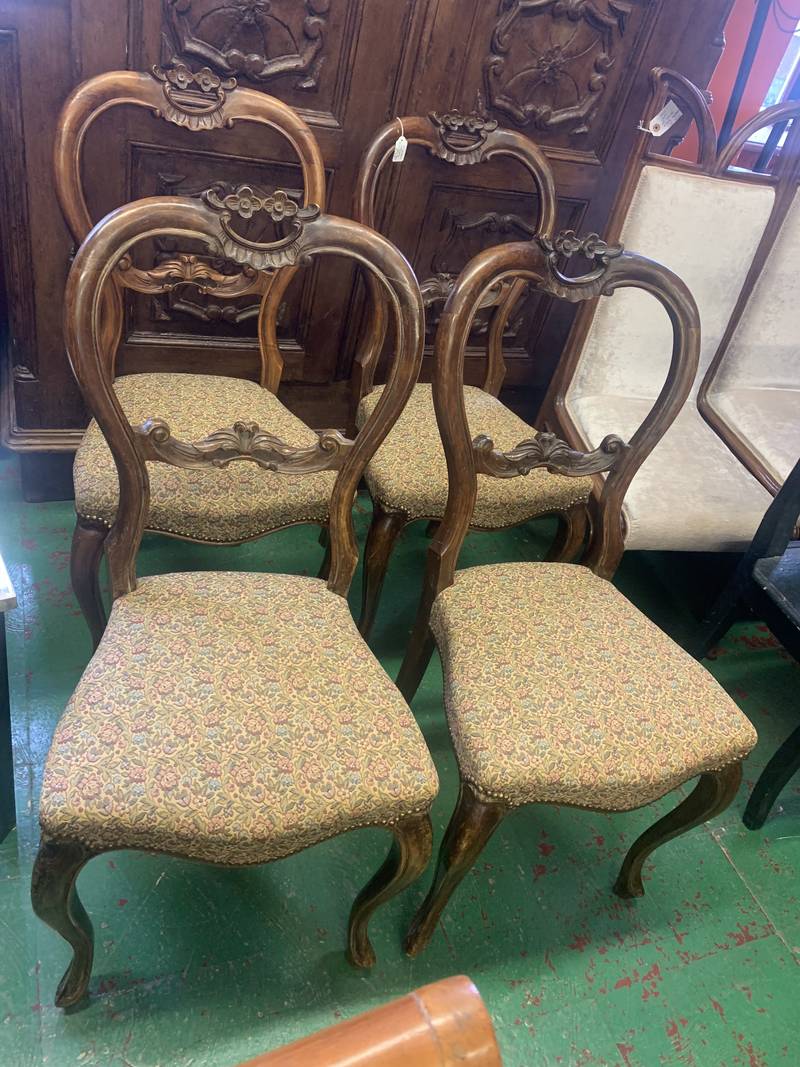 Gruppo di 4 antiche sedie in noce inglesi schienali intagliati sedute imbottite dell’800