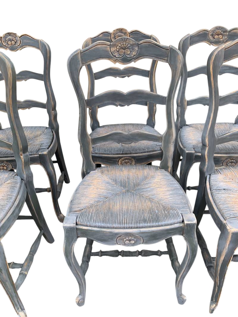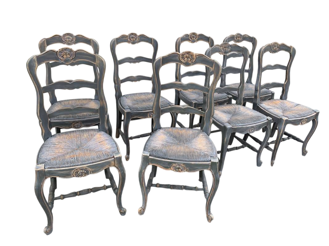 Gruppo di 8 sedie francesi impagliate lacca grigio azzurrolacca grigio azzurro polvere