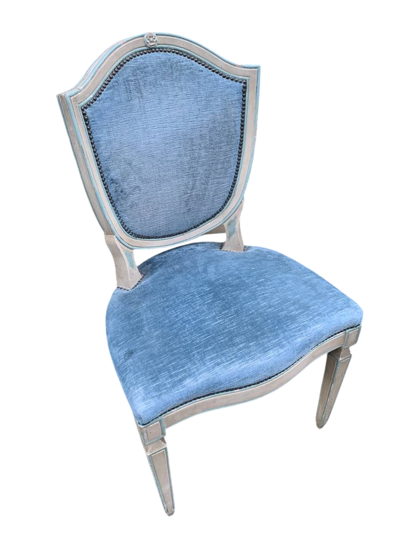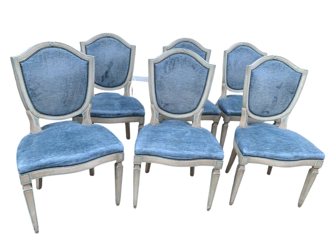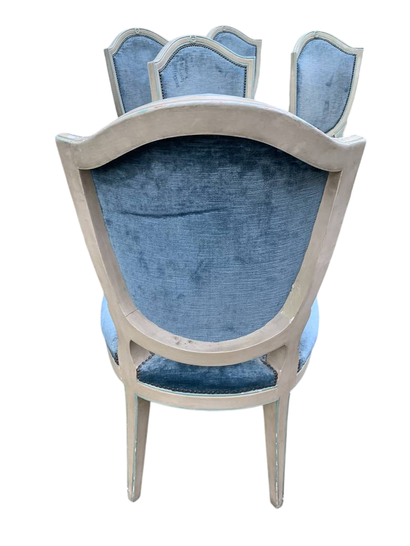 Gruppo di 6 sedie poltroncine Luigi XVI del XX sec laccate velluto azzurro