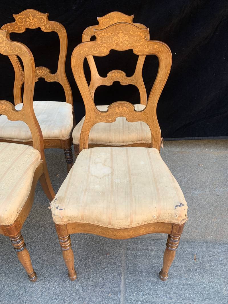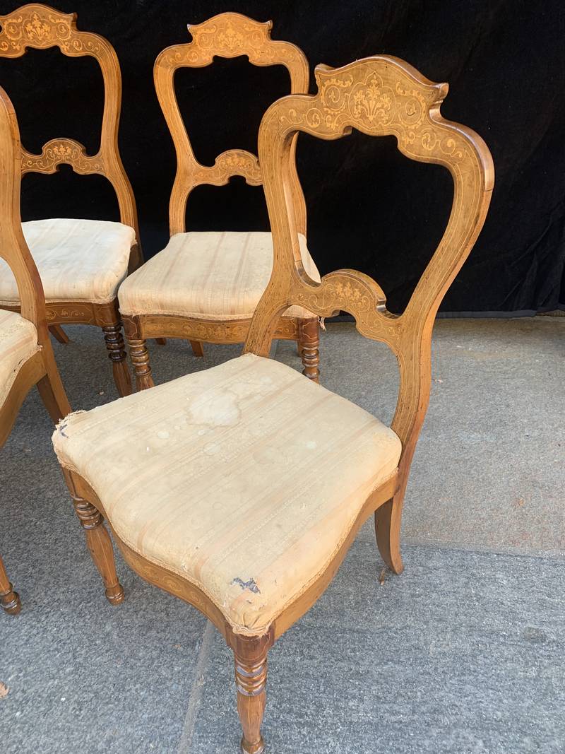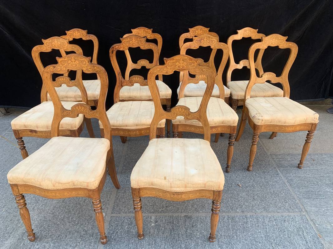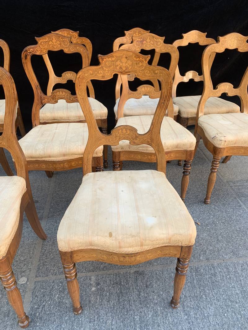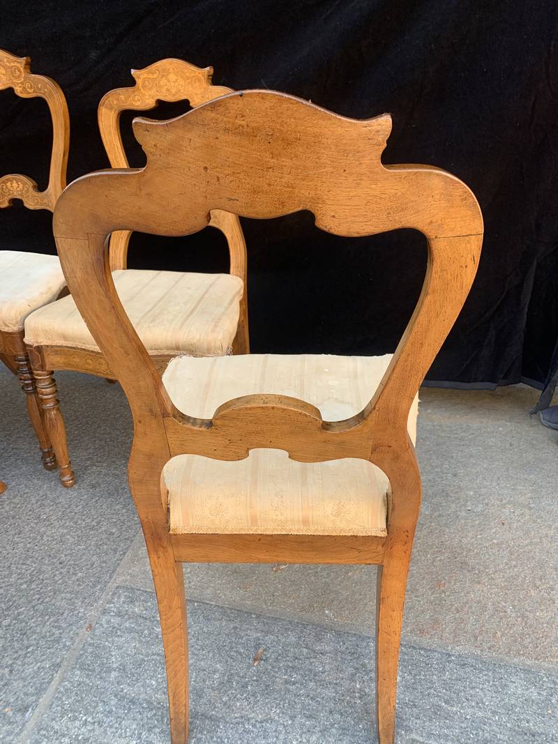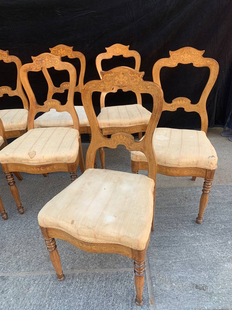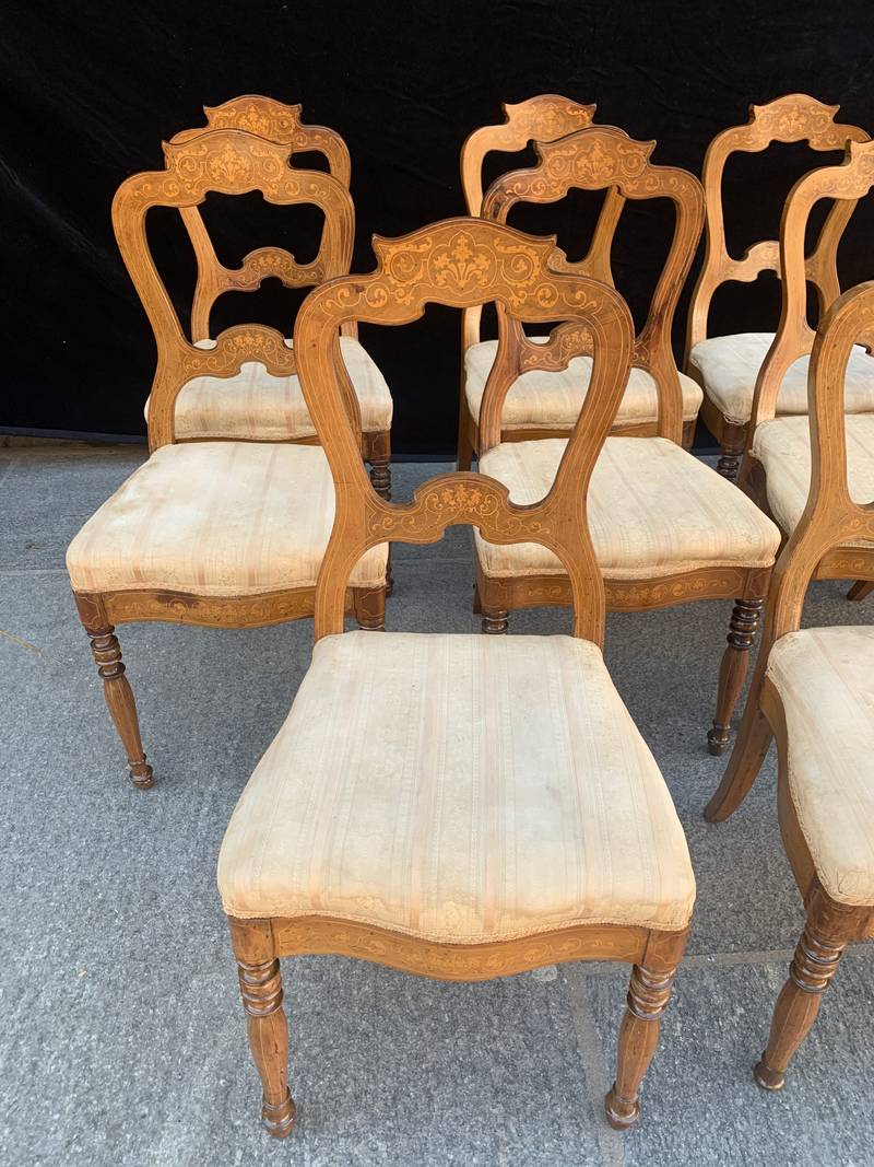 Gruppo di 8 antiche sedie in noce finemente intarsiate epoca Carlo X