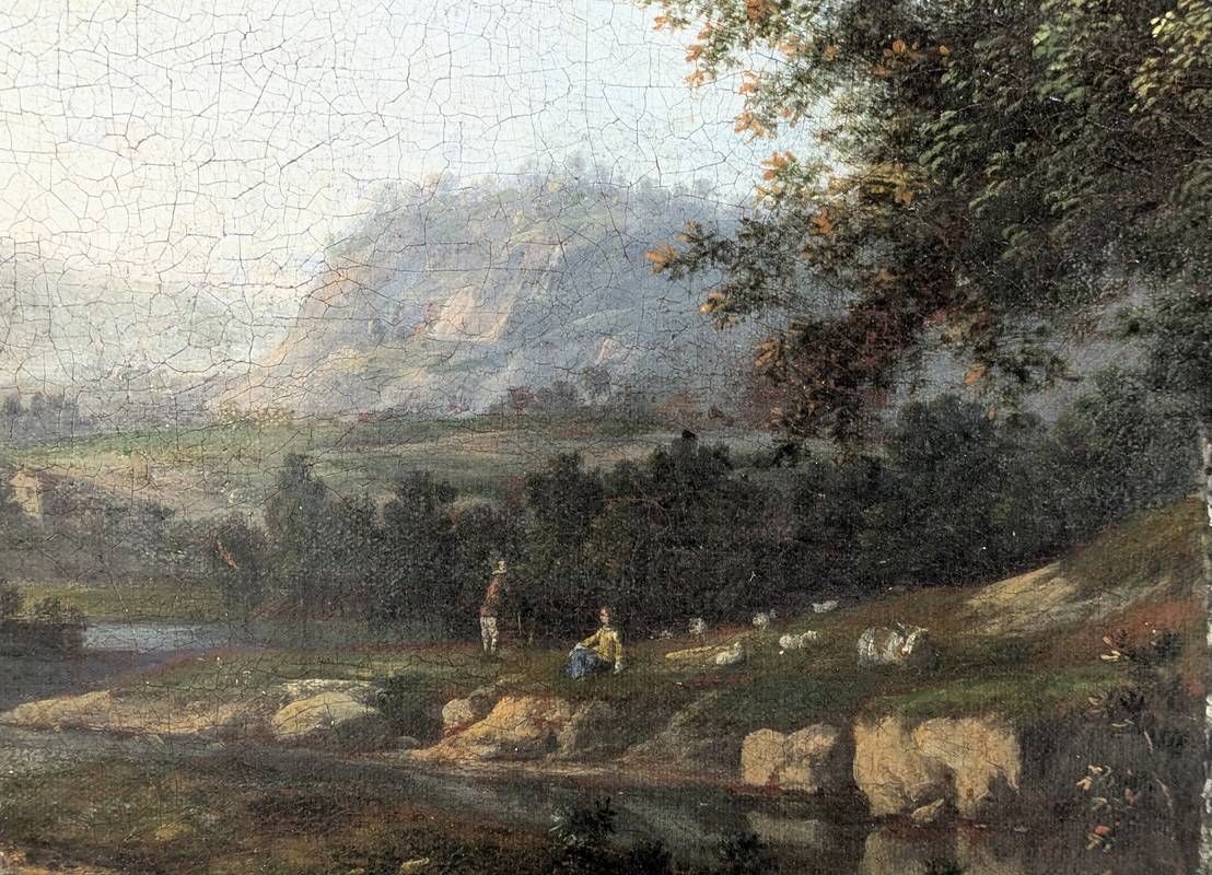 L’opera rappresenta un vasto paesaggio di campagna attraversato centralmente da un fiume che si snoda lungo le colline. La veduta offre uno sguardo a terre lontane, il cui orizzonte è appena visibile, sfumato dalla prospettiva aerea. Il paesaggio è popolato da figure di popolani colti nella quotidianità, chi a cavallo chi porta al pascolo il proprio gregge. Herman van Swanevelt ricrea il celebre paesaggio ideale settecentesco, un paesaggio idilliaco la cui atmosfera serena si riflette nell’uso luminoso dei colori.