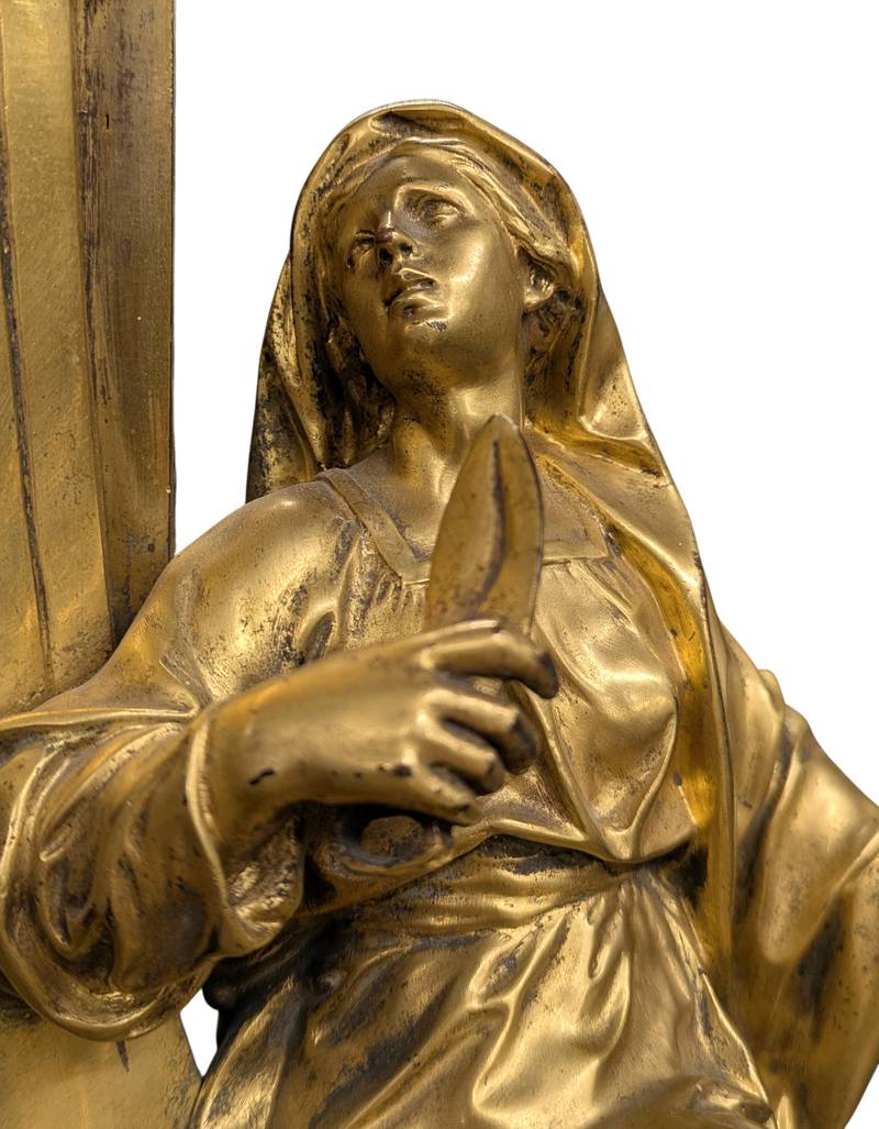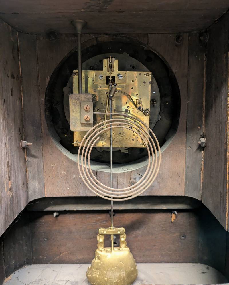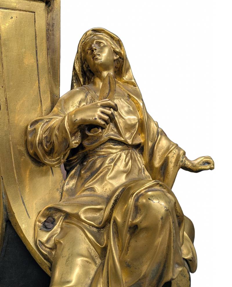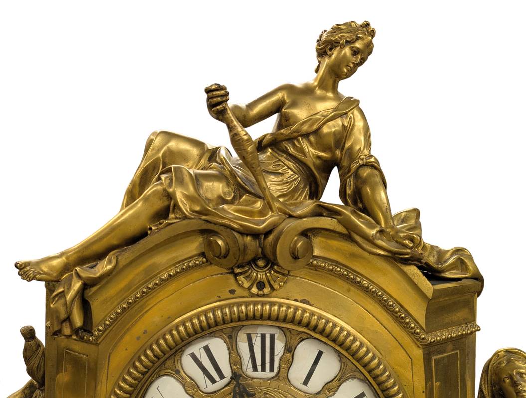 L’orologio è ulteriormente impreziosito da sculture a tuttotondo raffiguranti le tre Parche: a sinistra Clotho tiene il mandrino e srotola il filo che Lachesis tira (posizionato sopra il quadrante), mentre a destra Atropos si prepara a tagliarlo.