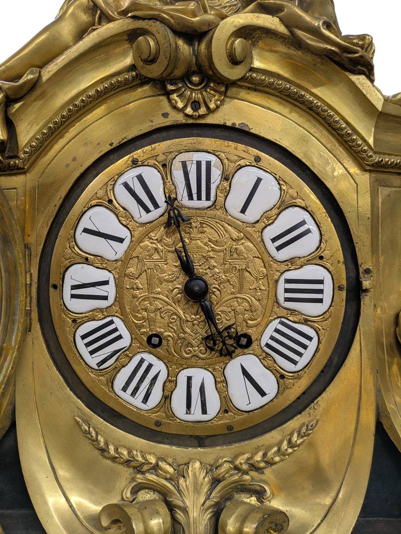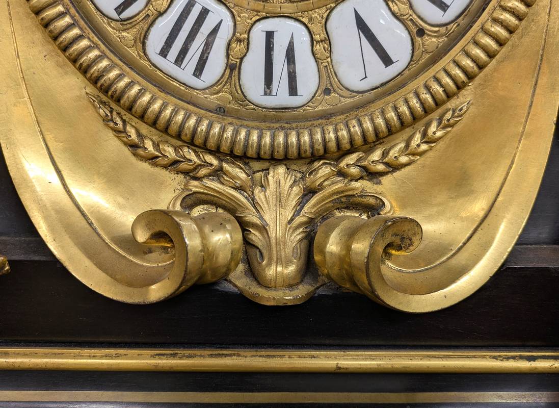Struttura in ebano ornata con ricche decorazioni in bronzo dorato, il quadrante presenta numeri romani su placche in porcellana.
