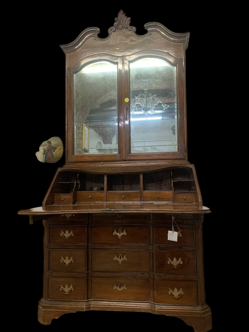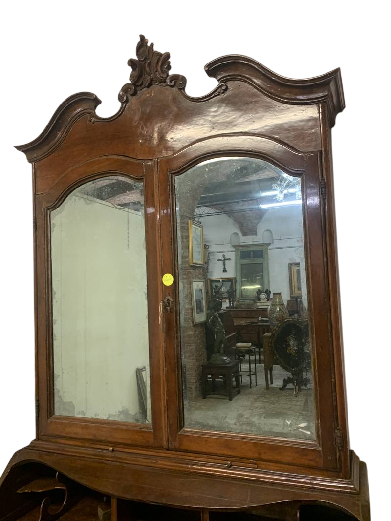la parte inferiore a cassetti con ribalta (scrittoio) e un’alzata superiore con specchi.