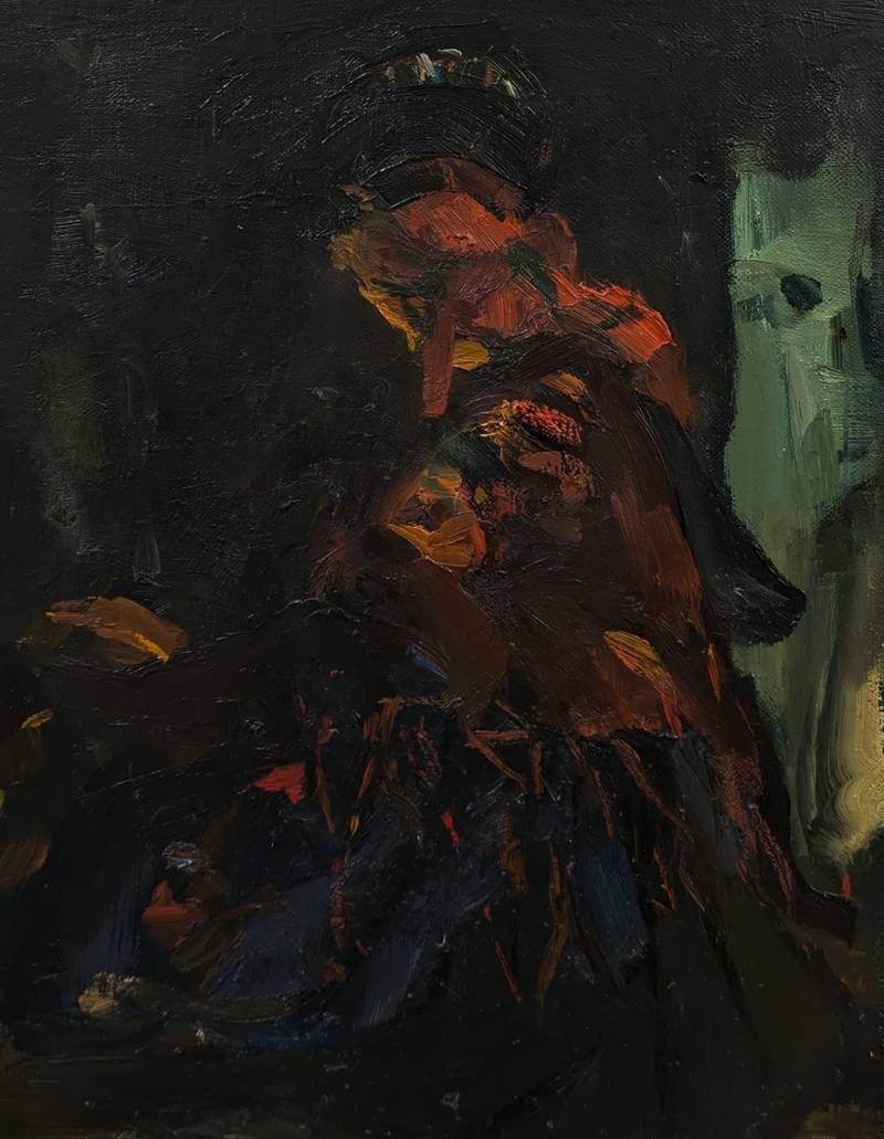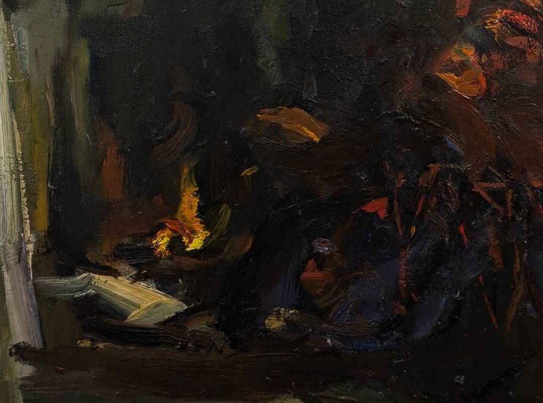 Ambientata in un interno ombreggiato, si nota una figura femminile di spalle avvicinare i palmi delle mani al fuoco di un camino per scaldarsi. Le pennellate sommarie ricreano l’intimità della scena e sembrano imitare l’effetto della vista in una situazione di poca luminosità, dove i bordi sono imprecisi e le forme si perdono nell’oscurità.