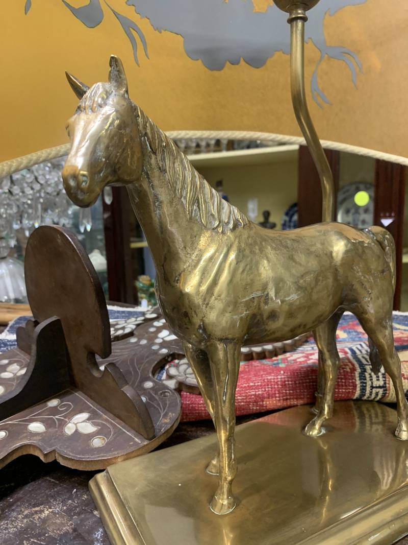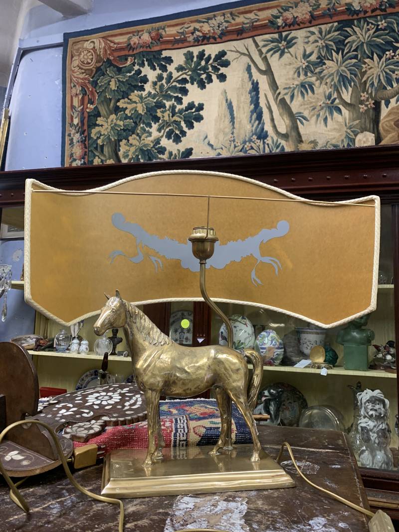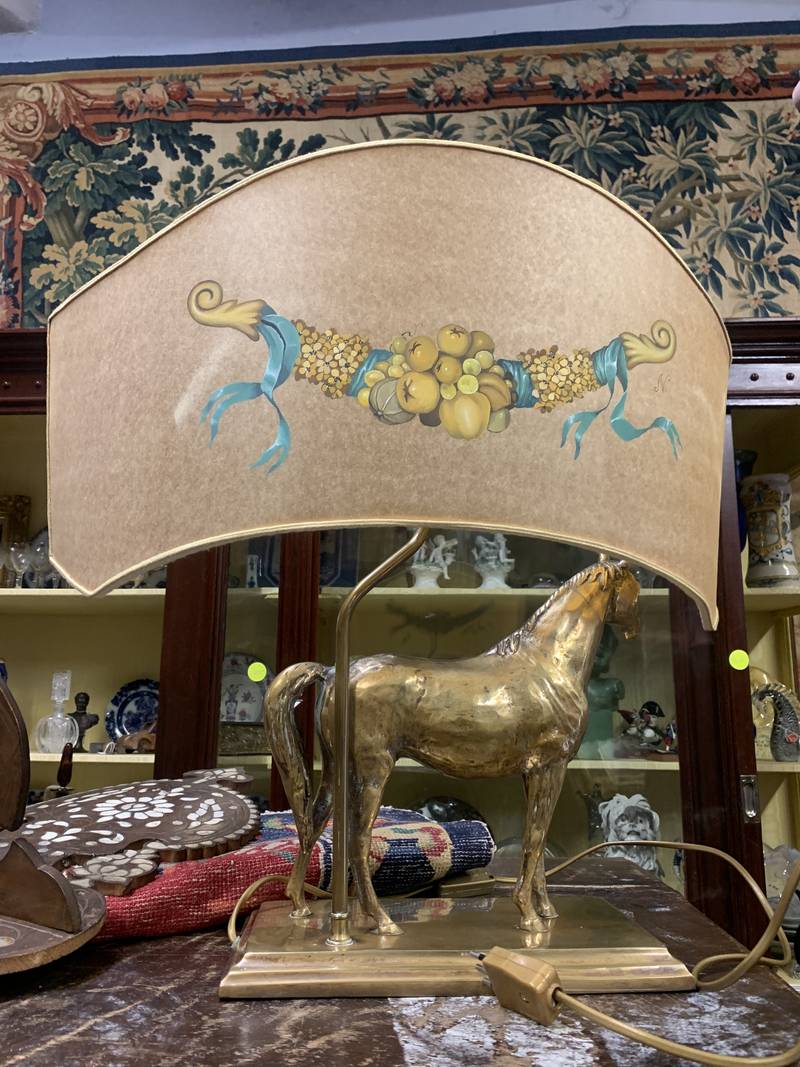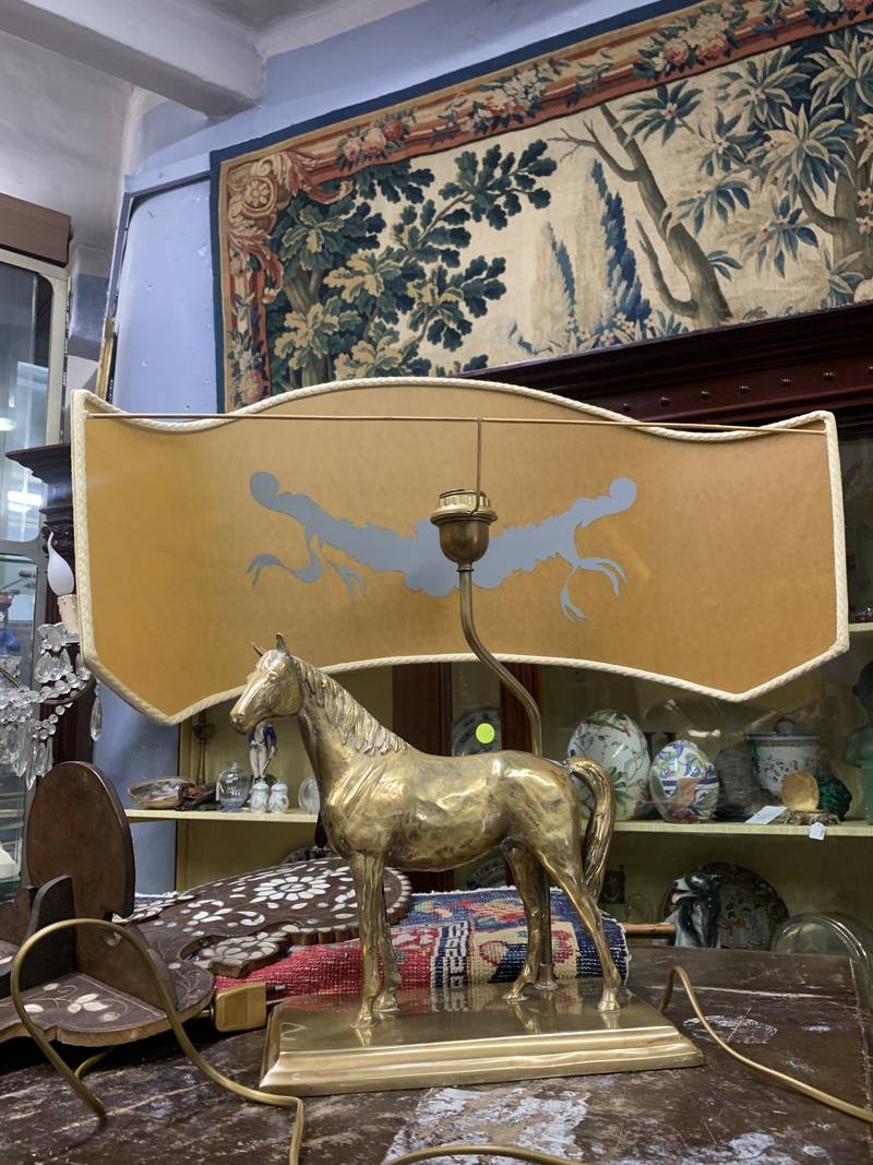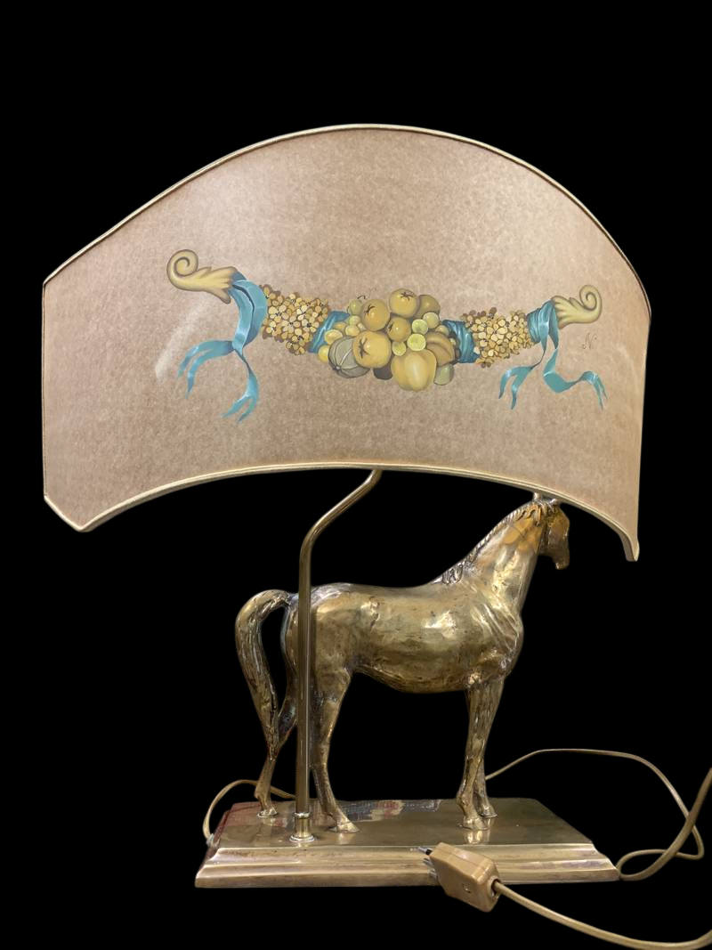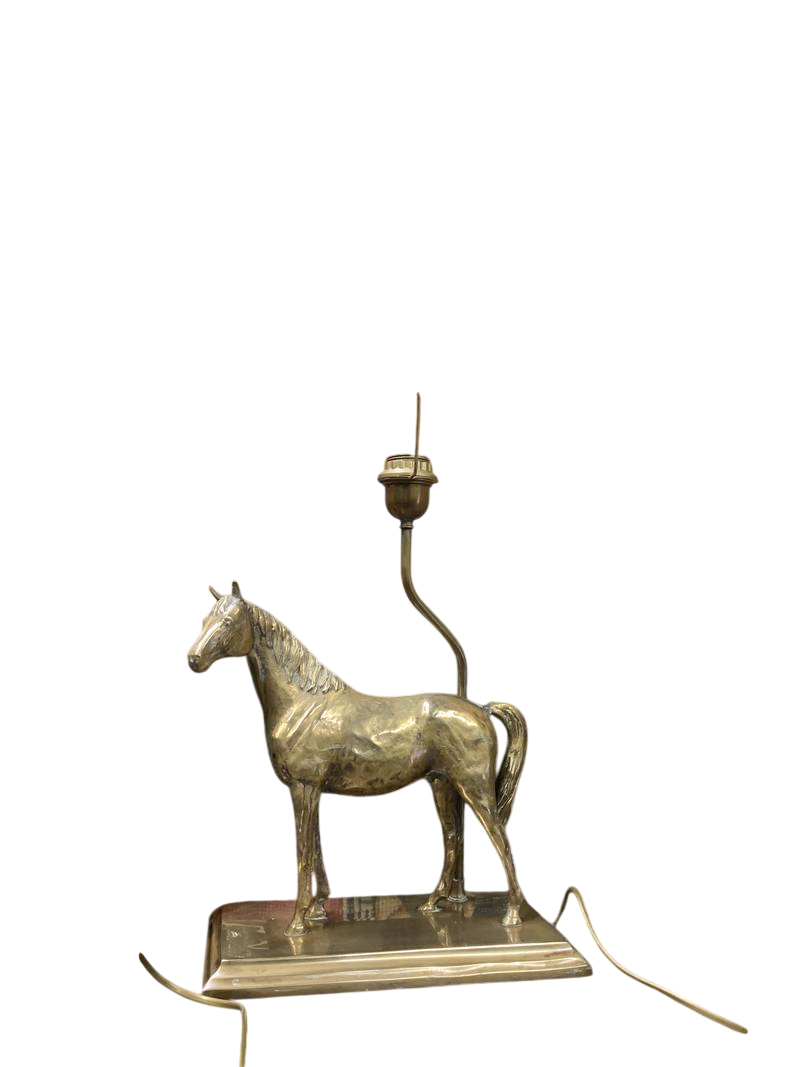 Lampada da tavolo anni 70 cavallo dorato Deknudt o in stile Maison Charles