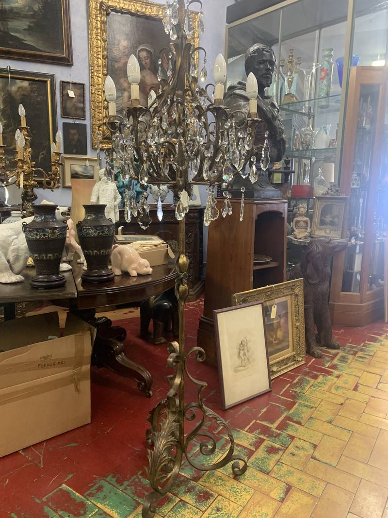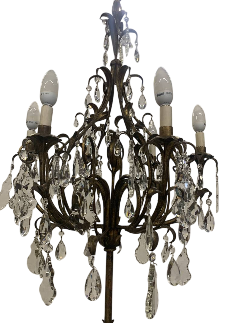 Lampada da terra 5 fiamme pendenti cristallo base in ferro forgiato e dorato epoca XX secolo