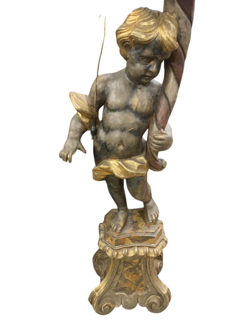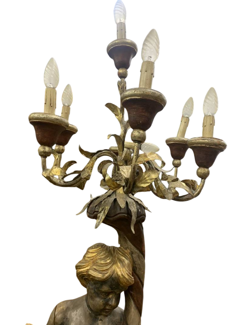 Lampada da terra antico grande candelabro in legno intagliato e dorato con putto in legno scolpito e dorato