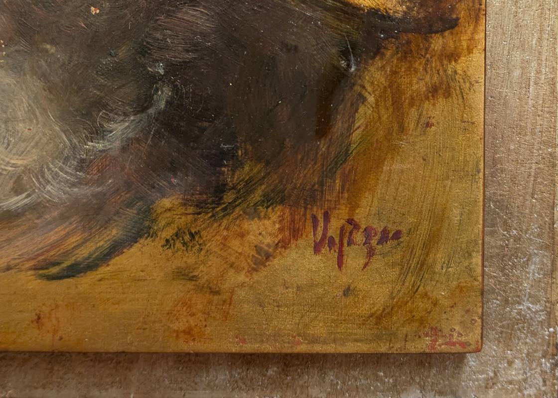 Coppia di ritratti a olio su pannello firmati in basso a destra Lucianella Voerzio.