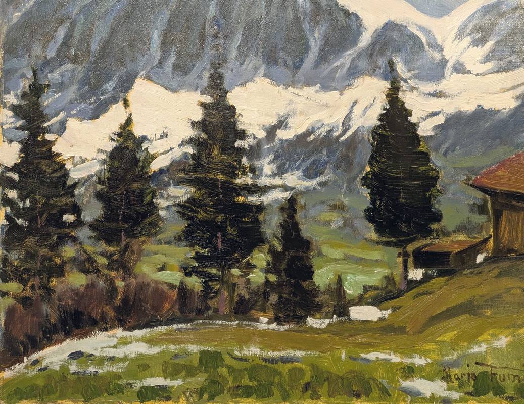 L’opera raffigura un paesaggio: in primo piano vi è una valle con degli abeti, sullo sfondo si stagliano delle alte montagne parzialmente innevate.