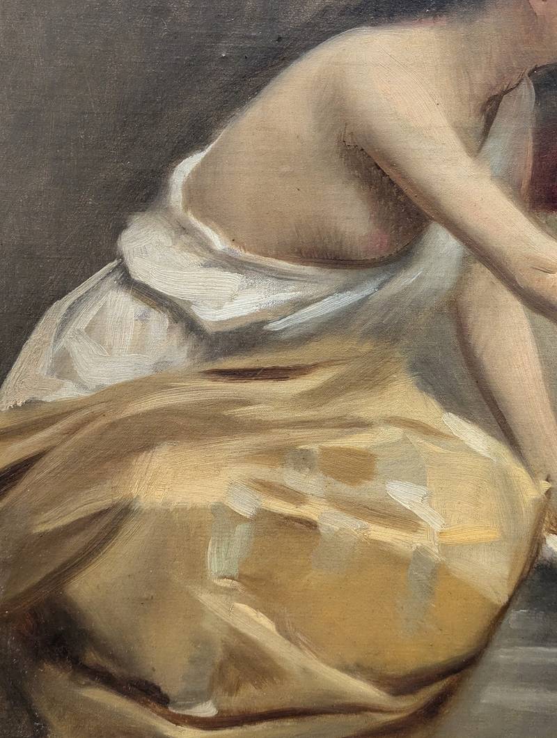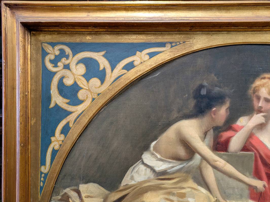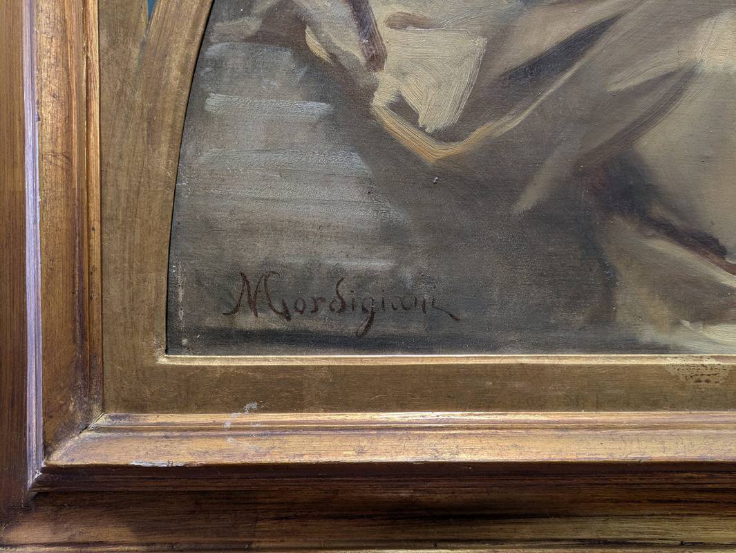 Dipinto a olio su cartone firmato in basso a sinistra Michele Gordigiani (Firenze, 29 maggio 1835 – 7 ottobre 1909), importante pittore italiano apprezzato per i suoi ritratti, i quali furono commissionati dalle più prestigiose corti d’Europa. L’interesse per il genere storico-mitologico risale ai primi anni di attività dell’artista, a cui si riconduce il presente dipinto.