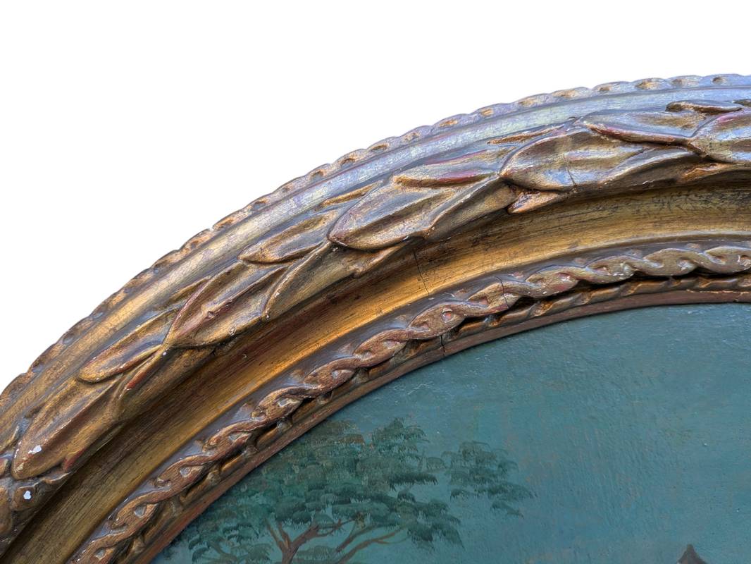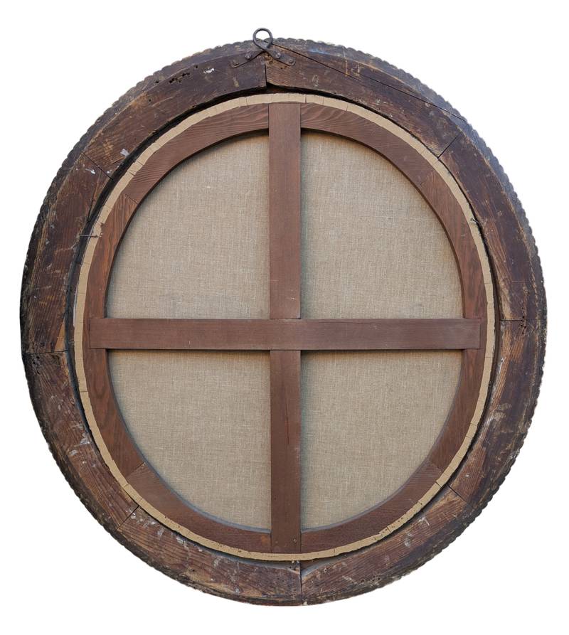In ottime condizioni conservative come da fotografie, entro antica cornice coeva in legno scolpito a foglie e dorato.