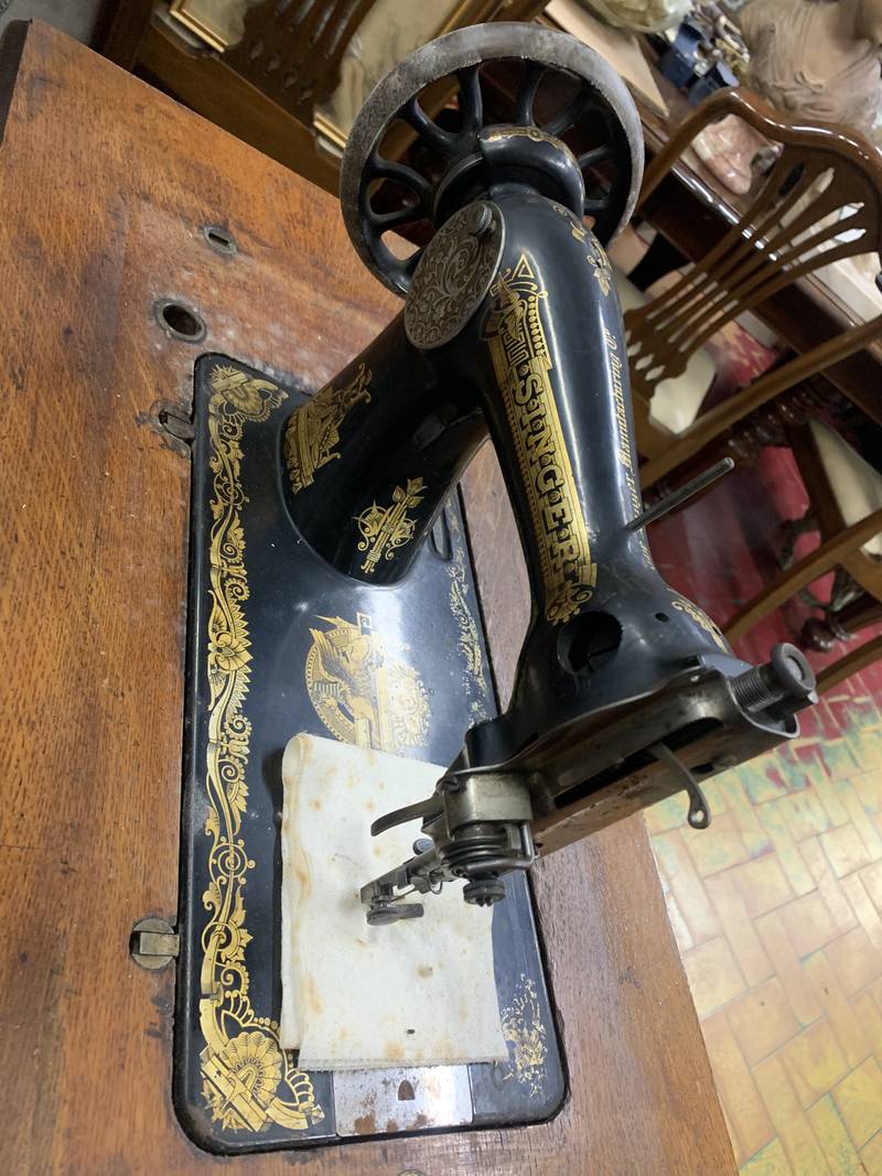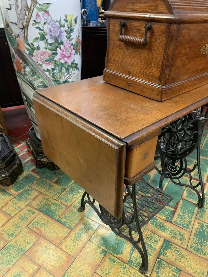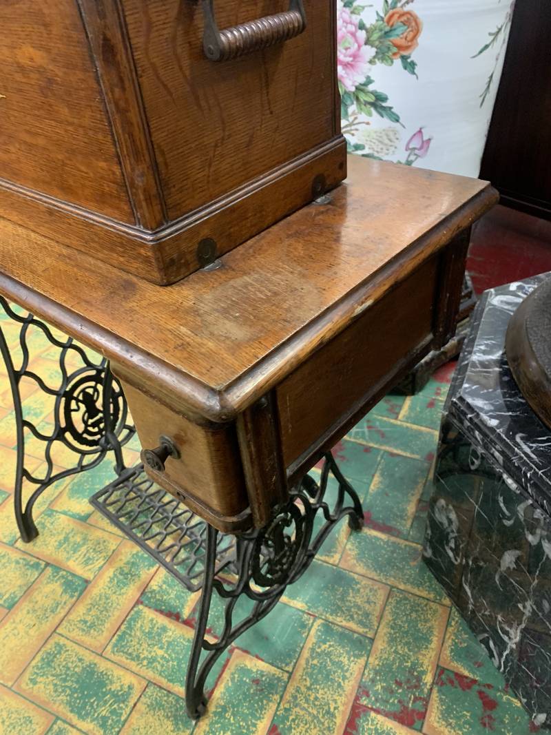 Antica macchina da cucire Singer con mobile in legno e base in ghisa.