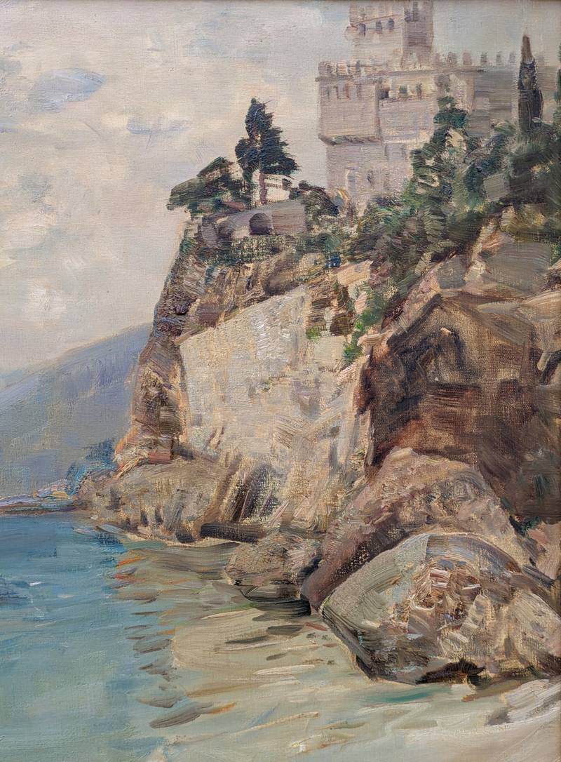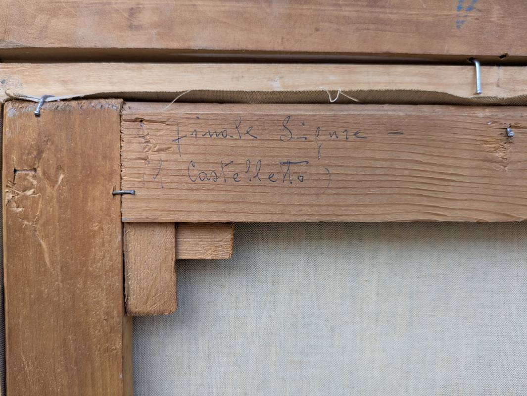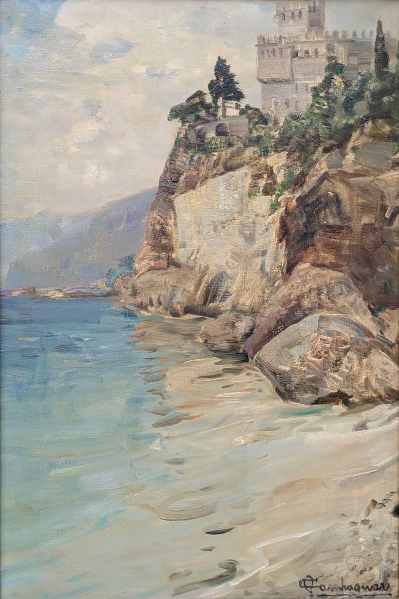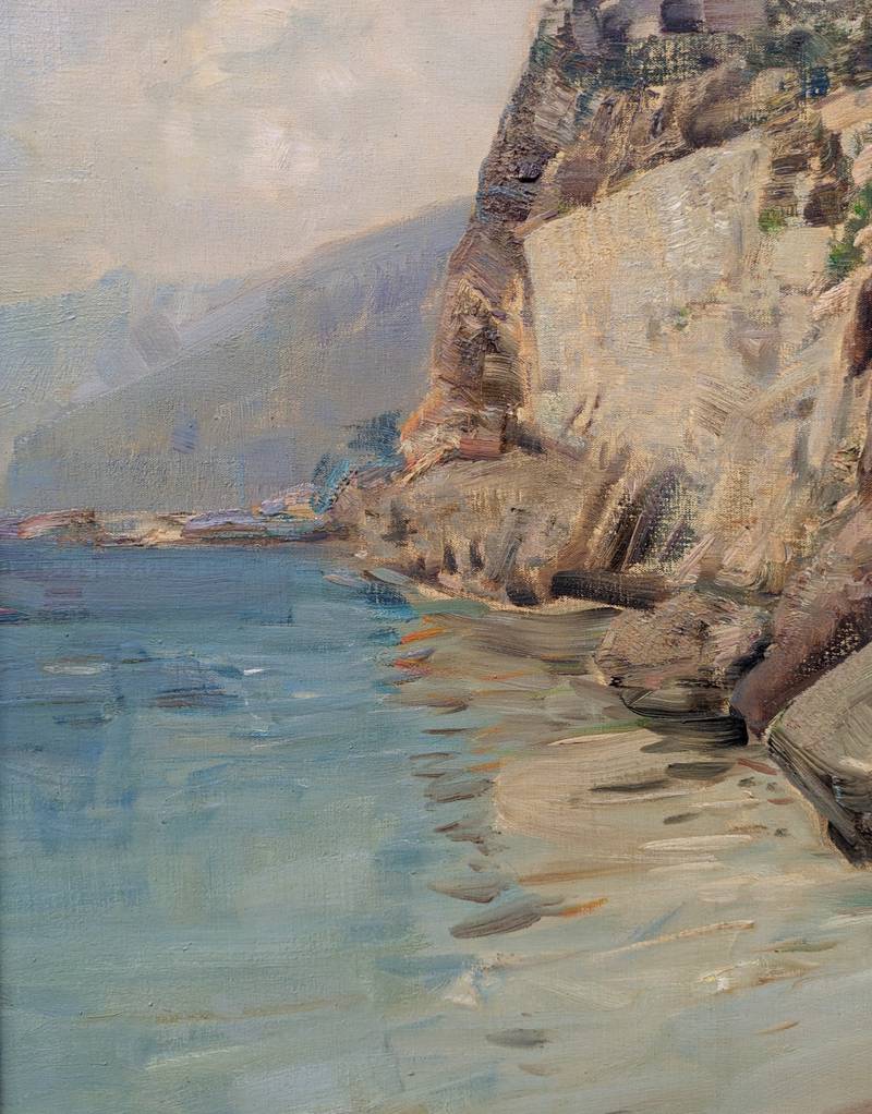 L’opera raffigura una veduta dalla spiaggi di Finale Ligure, come indicato al retro del telaio, con vista sul Castelletto.
