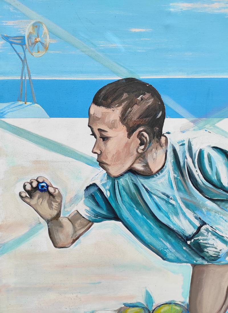 L’opera ritrae un ragazzino che gioca sulla spiaggia con le biglie: il giovane è immortalato mentre prende la mira poco prima del lancio, con una posa fortemente dinamica esaltata da linee azzurre che ne seguono la traiettoria. Ai suoi piedi, sulla sabbia, vi è un libro di Fisica dei fluidi.
