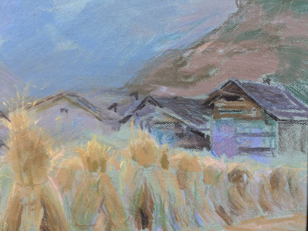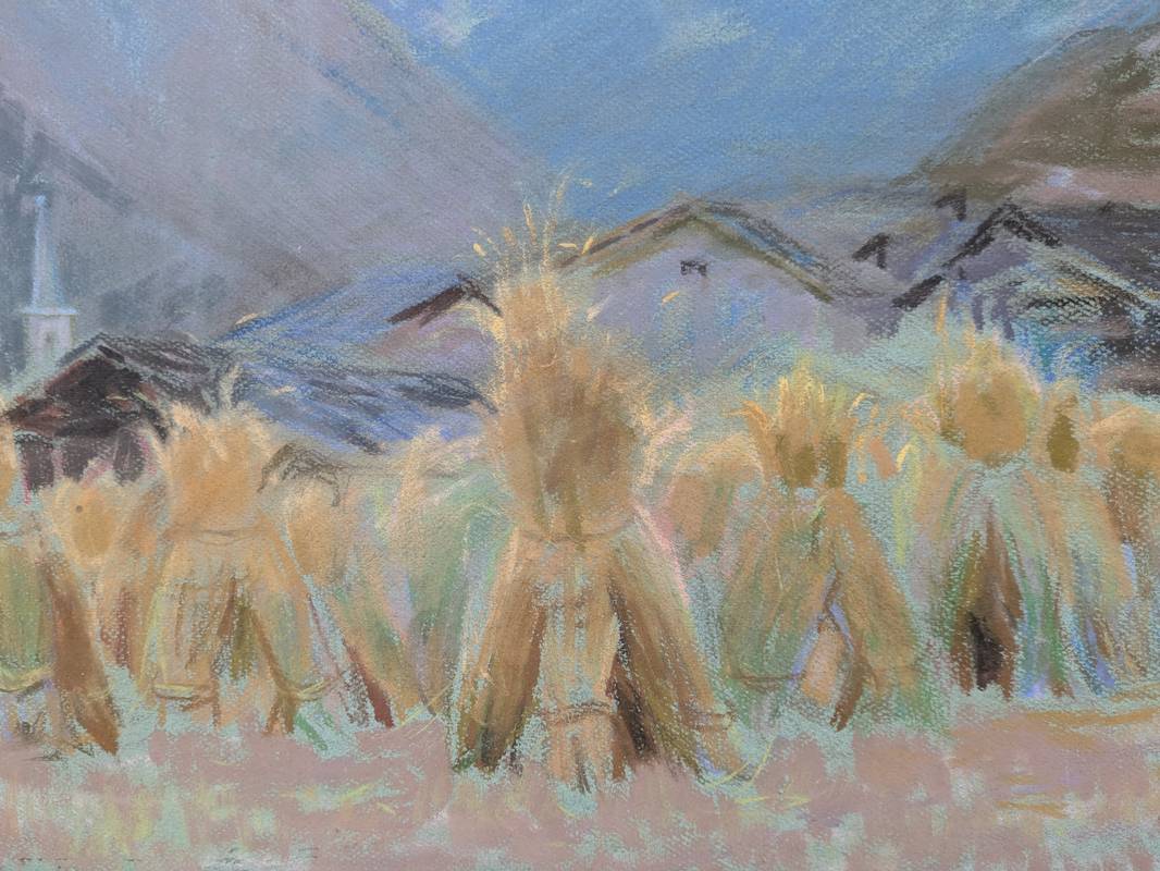 L’opera raffigura paesaggio: in primo piano vi è un paese davanti al quale si stende un campo di fieno, mentre sullo sfondo vi sono delle montagne in prospettiva aerea.