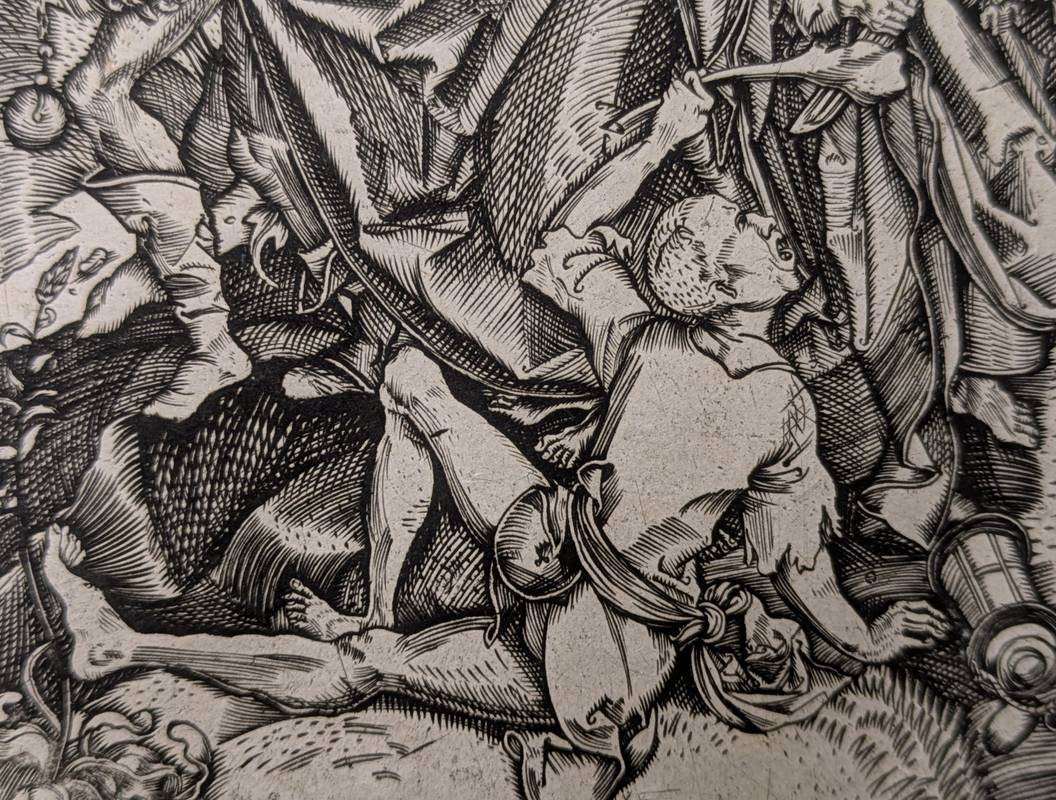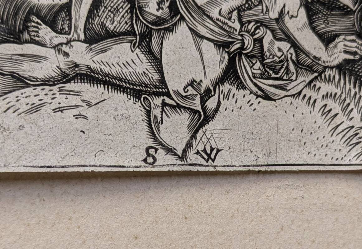 Incisione su metallo firmata in basso al centro con le iniziali SW, della grande scuola dei monogrammisti tedeschi del gruppo di Schoganer.