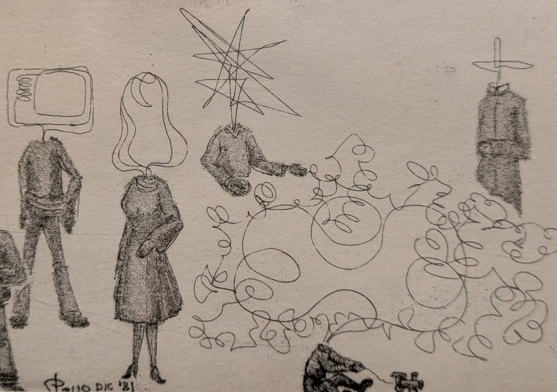 Opera dal titolo Teste con diverse figure le cui teste sono state sostituite da oggetti o simboli.