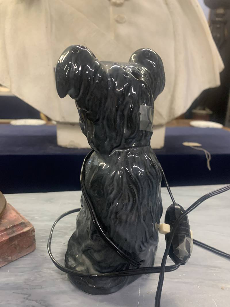 Una piccola lampada veilleuse francese in ceramica Art Deco a forma di cagnolino anni 30