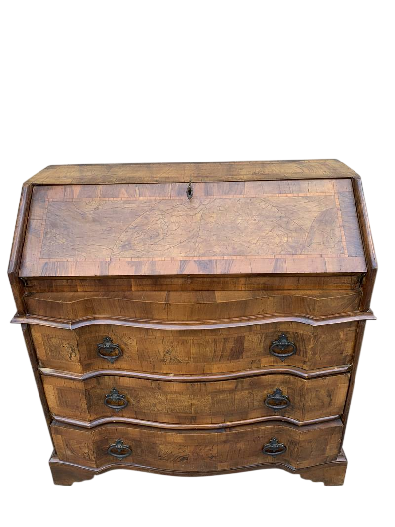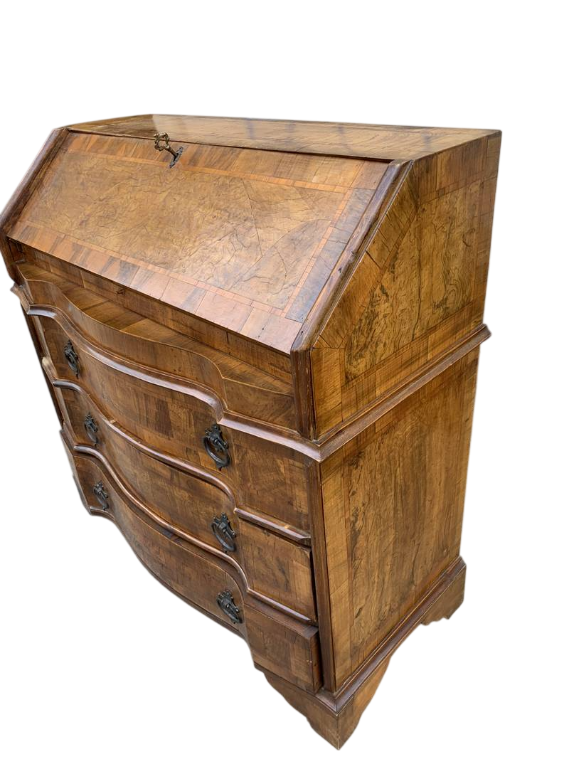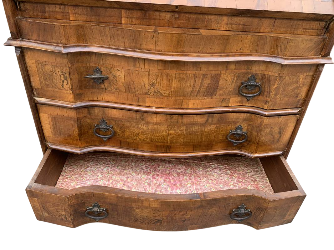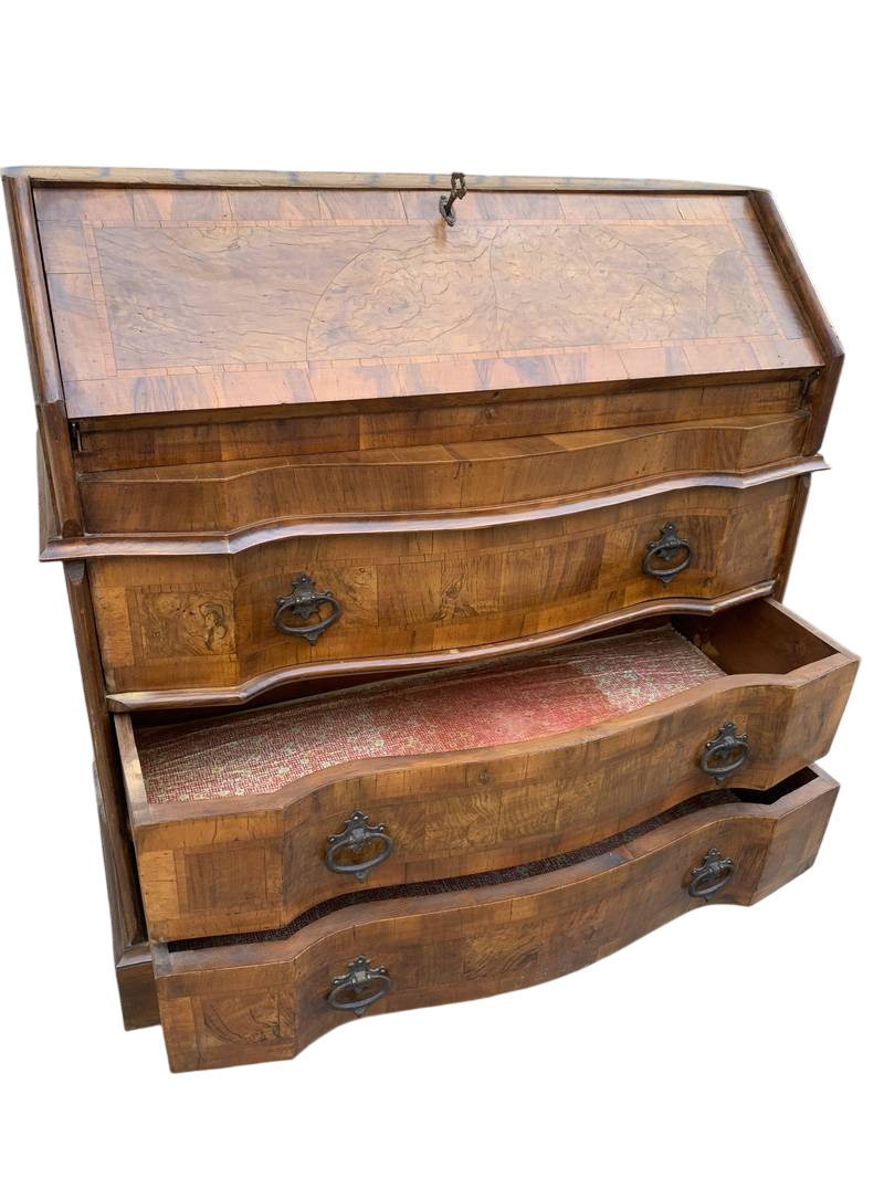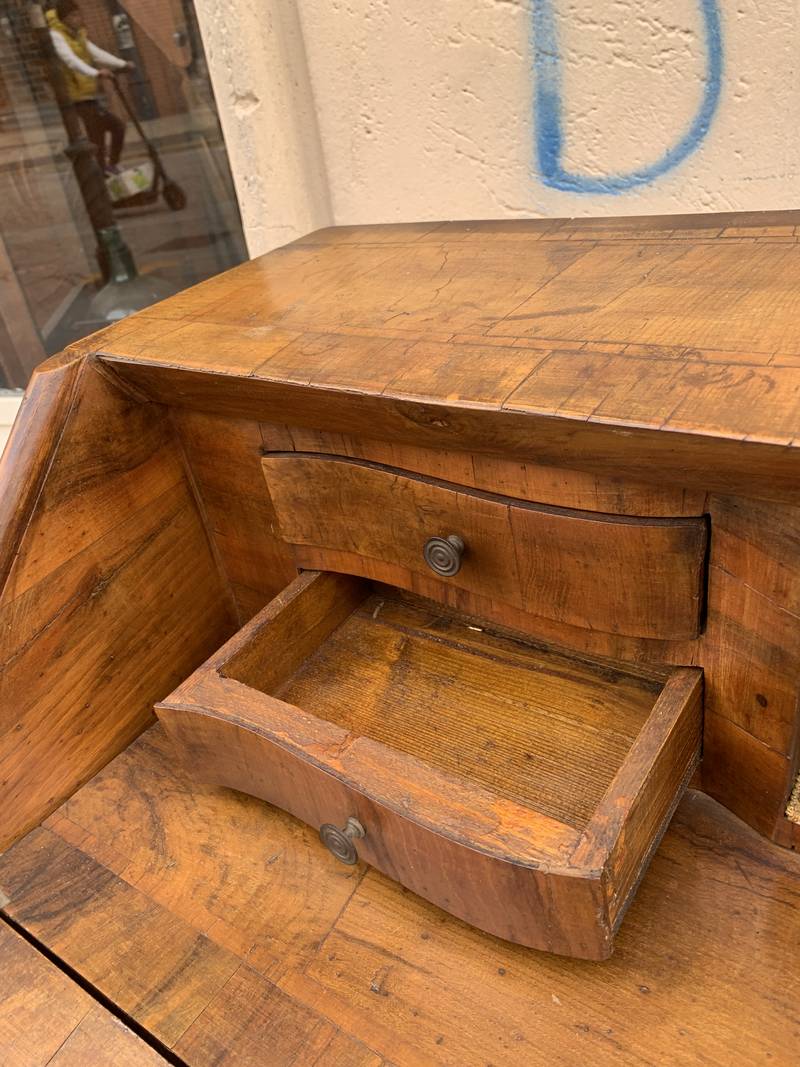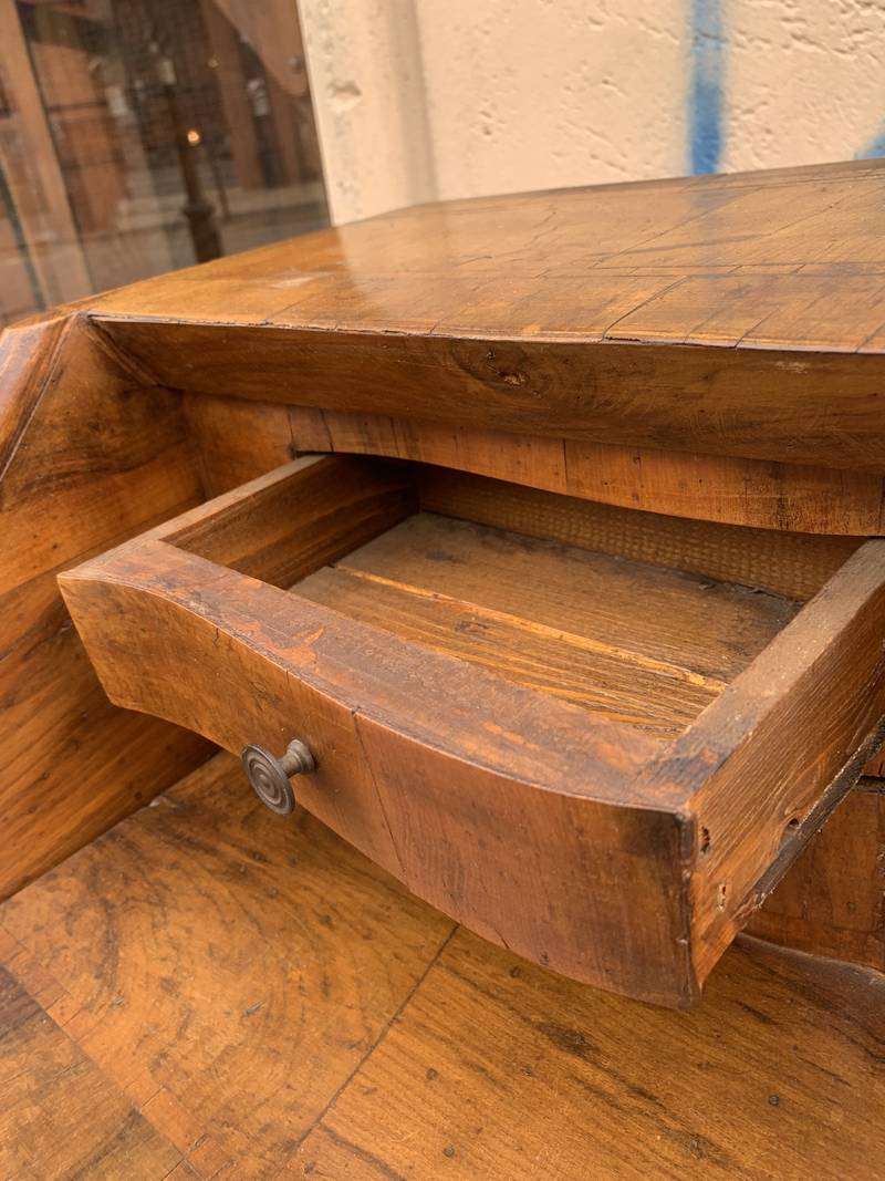 Piccolo cassettone mosso con ribaltina con scrittoio e cassettini interni