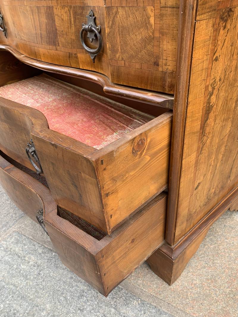 Piccolo cassettone mosso con ribaltina intarsiata in radica del XX secolo