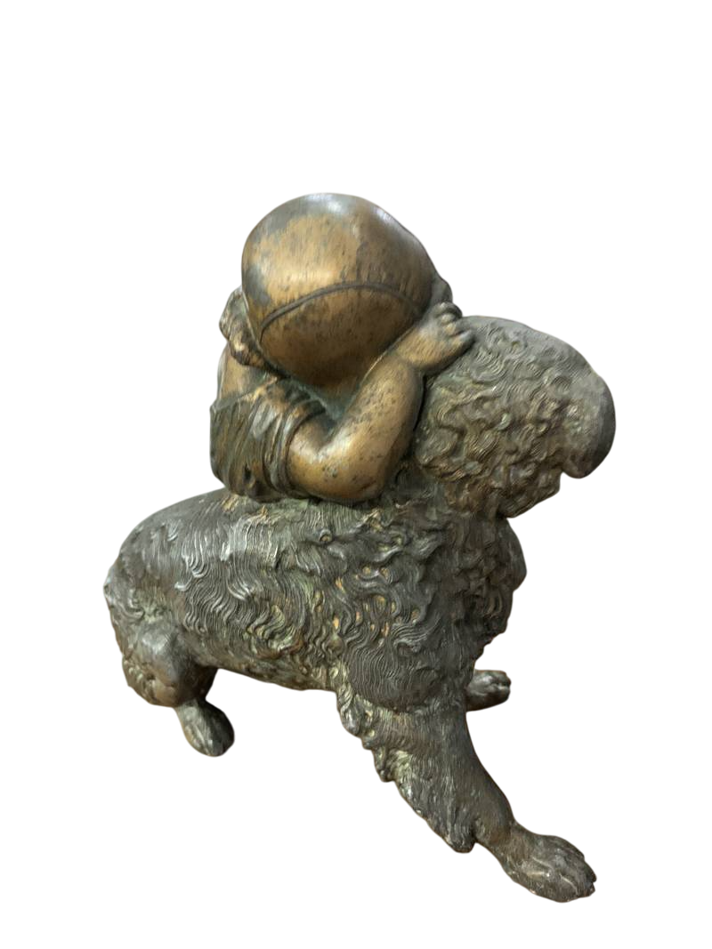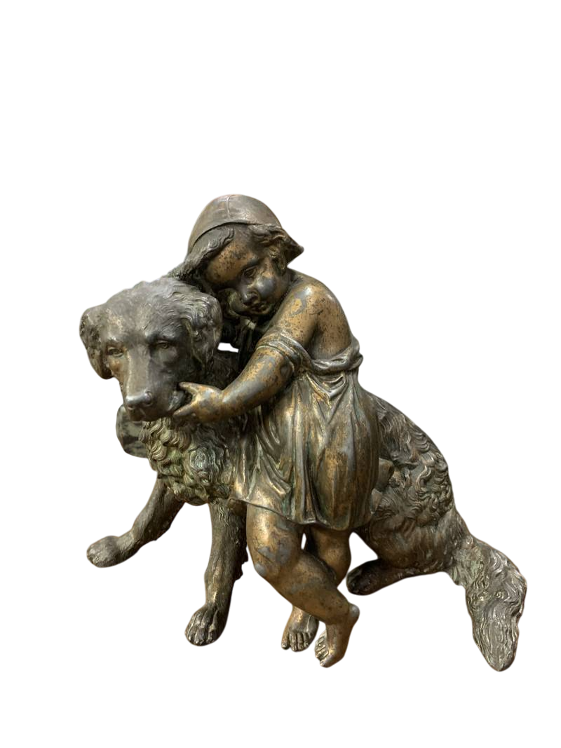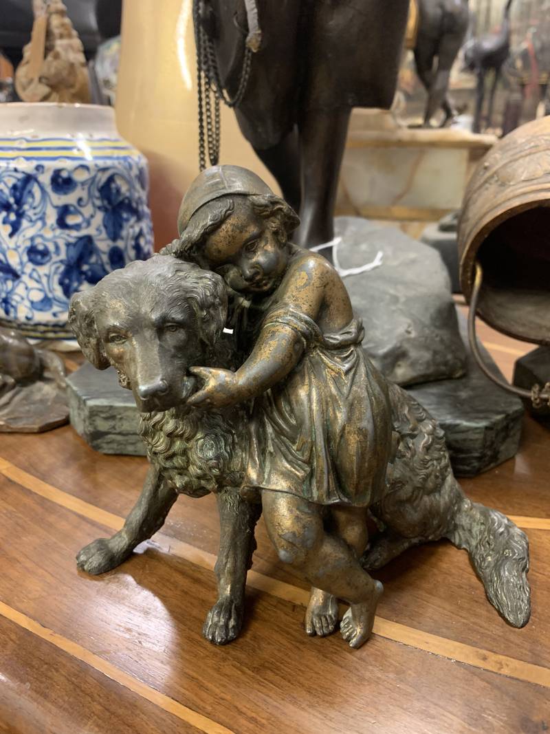 Piccolo scultura francese bimba con cane in patina spelter primi del 900