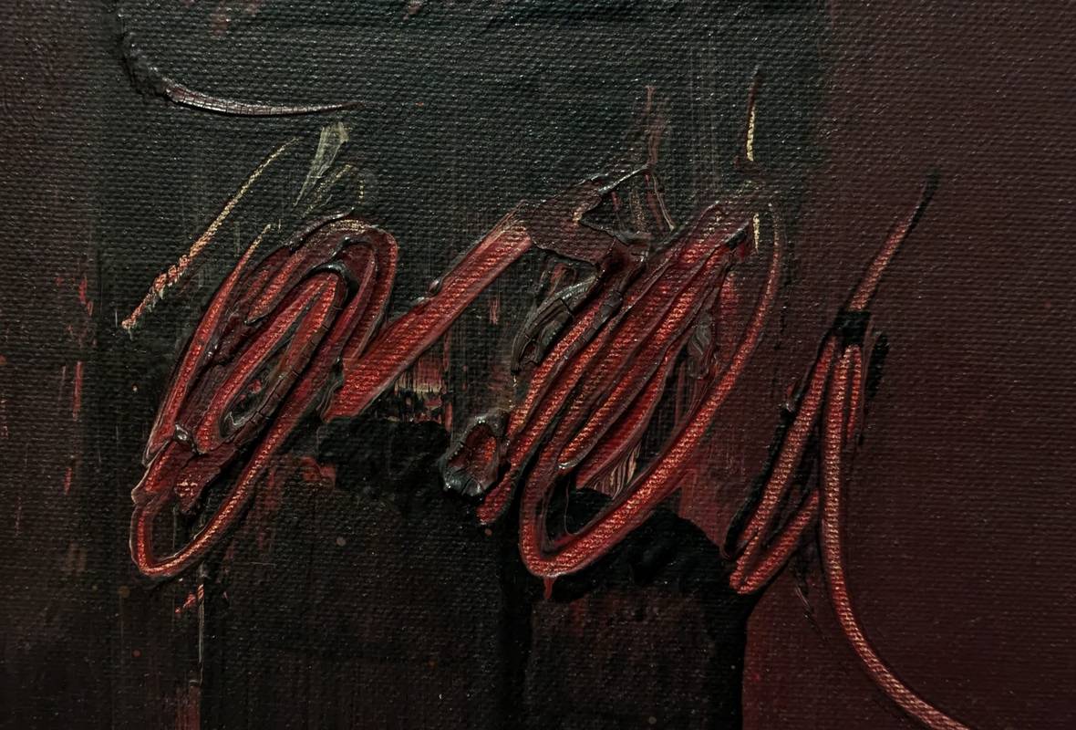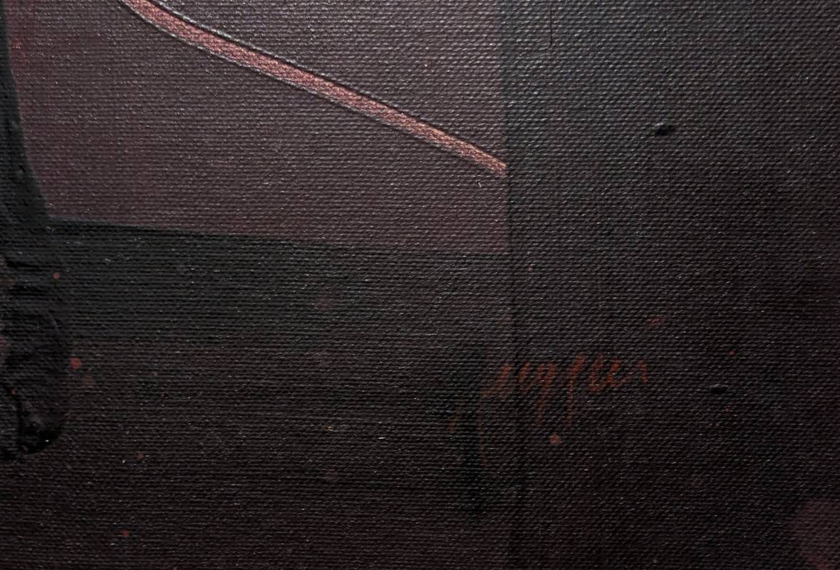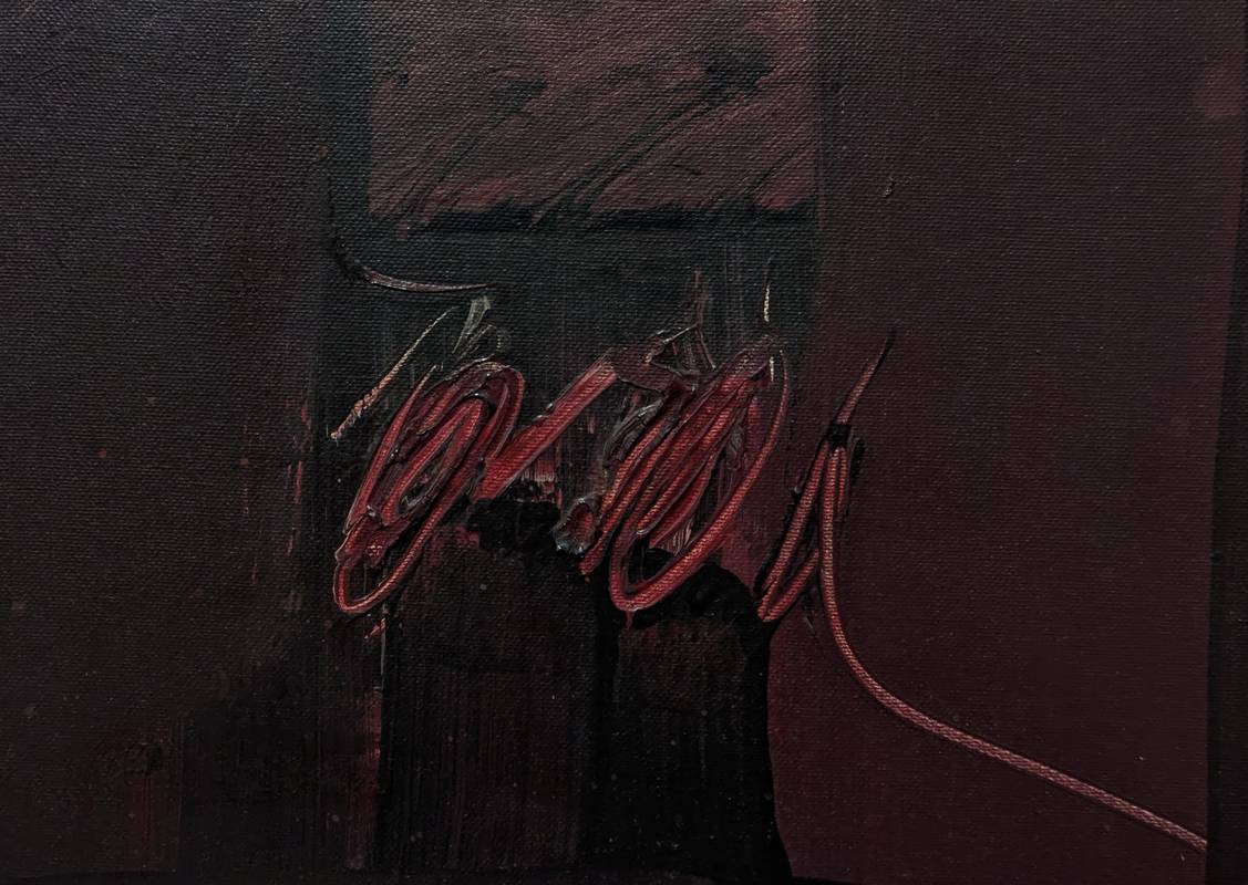Opera astratta dai toni scuri cui il colore a olio si fa espressione attraverso il gesto, che trova il suo fulcro nella parte centrale.