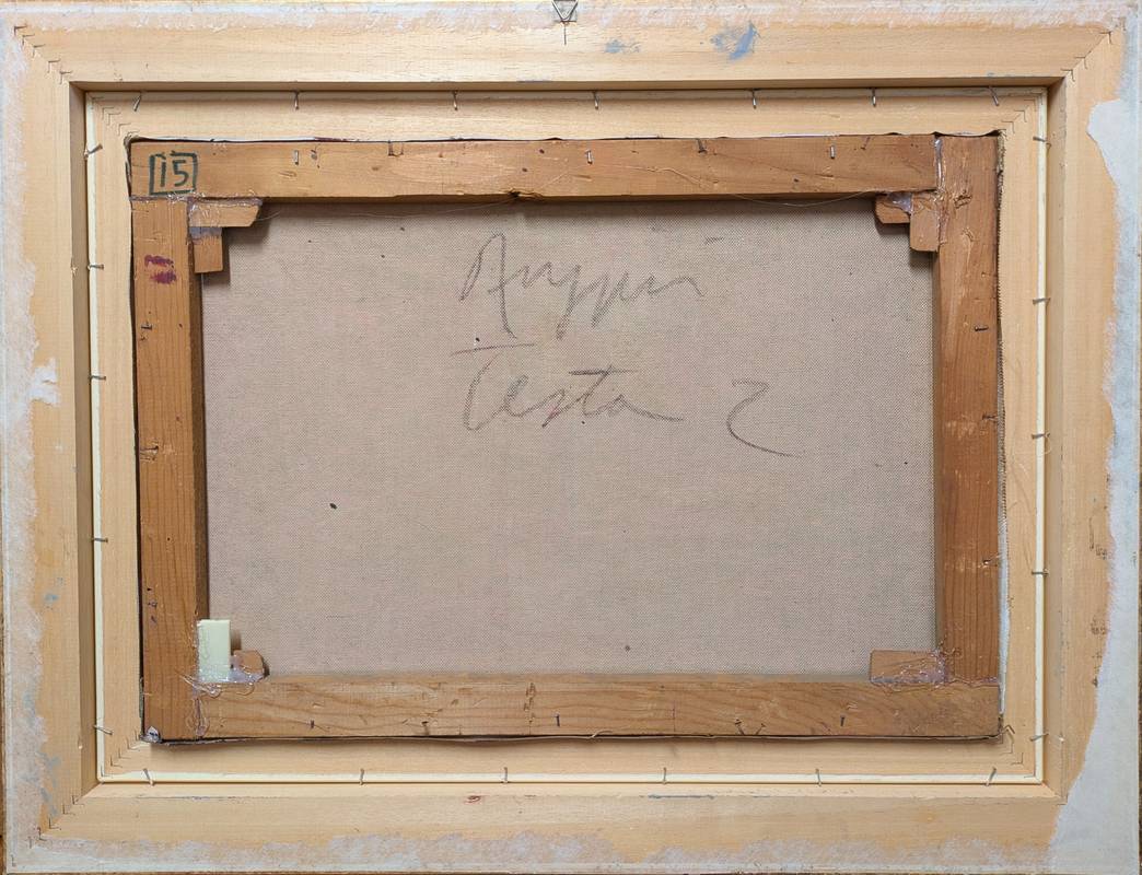 Dipinto a olio su tela firmato in basso a destra Piero Ruggeri (Torino, 27 aprile 1930 – Avigliana, 14 maggio 2009), artista tra i principali esponenti della pittura informale italiana. Il lavoro è databile agli anni ’60, infatti durante questi anni Ruggeri si dedicò a diversi dipinti con lo stesso titolo (Testa).