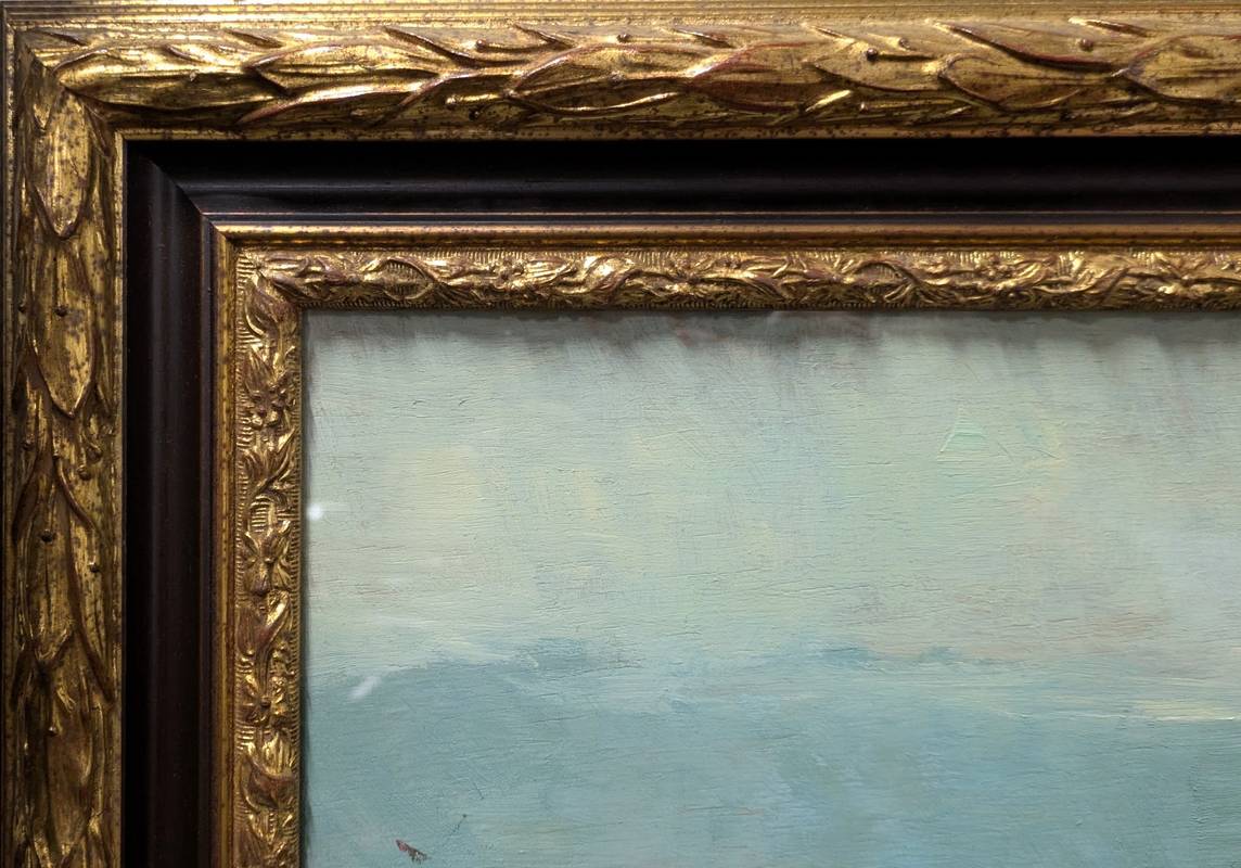 In ottime condizioni conservative come da fotografie, entro cornice con decoro a foglie, dorata e laccata, con vetro.
