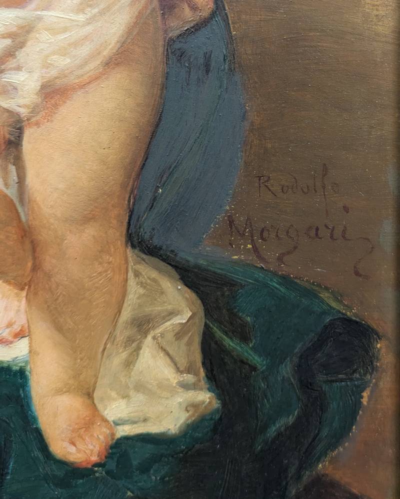 Dipinto a olio su tavola firmato sul lato destro Rodolfo Morgari (Torino, 1827 – 1909) pittore, decoratore e restauratore italiano.