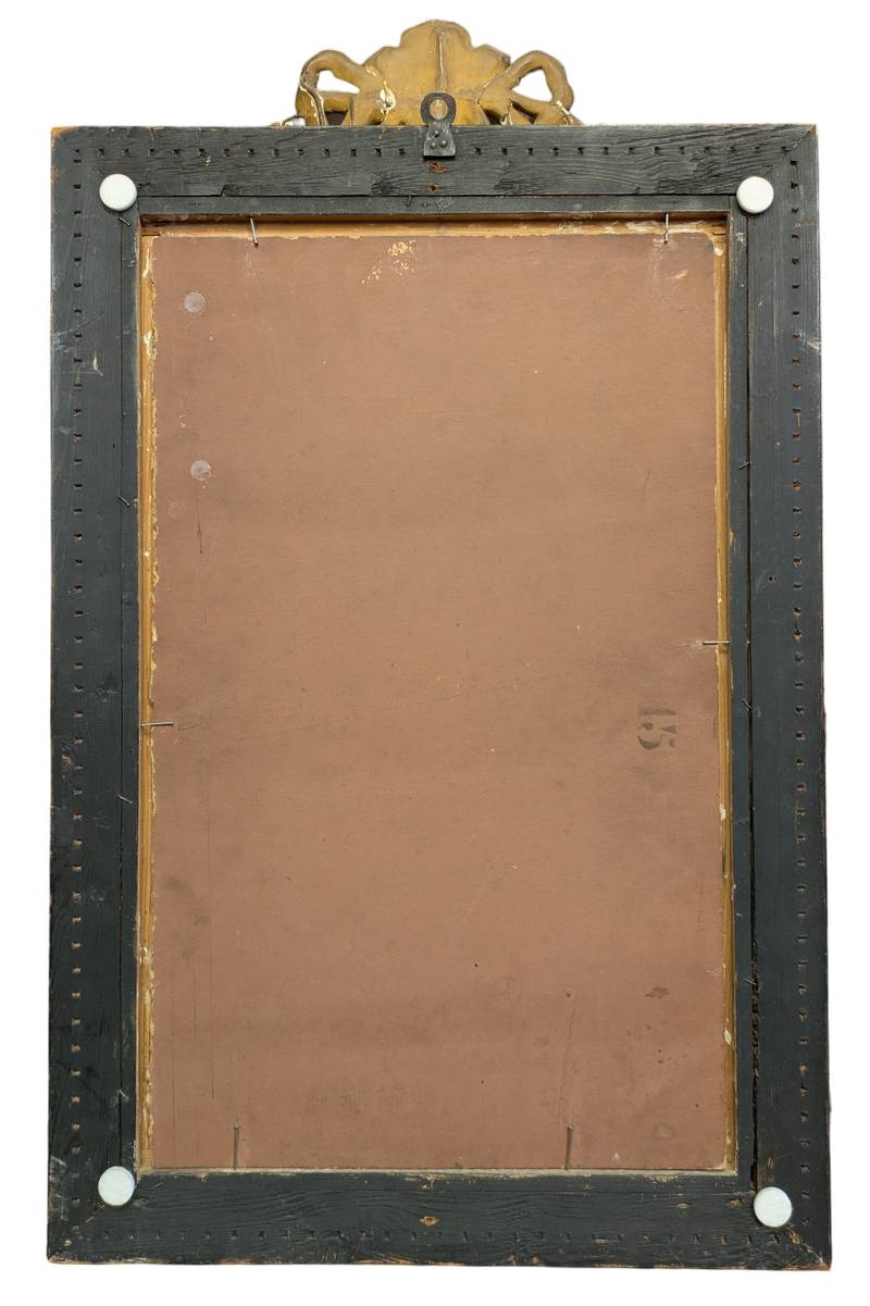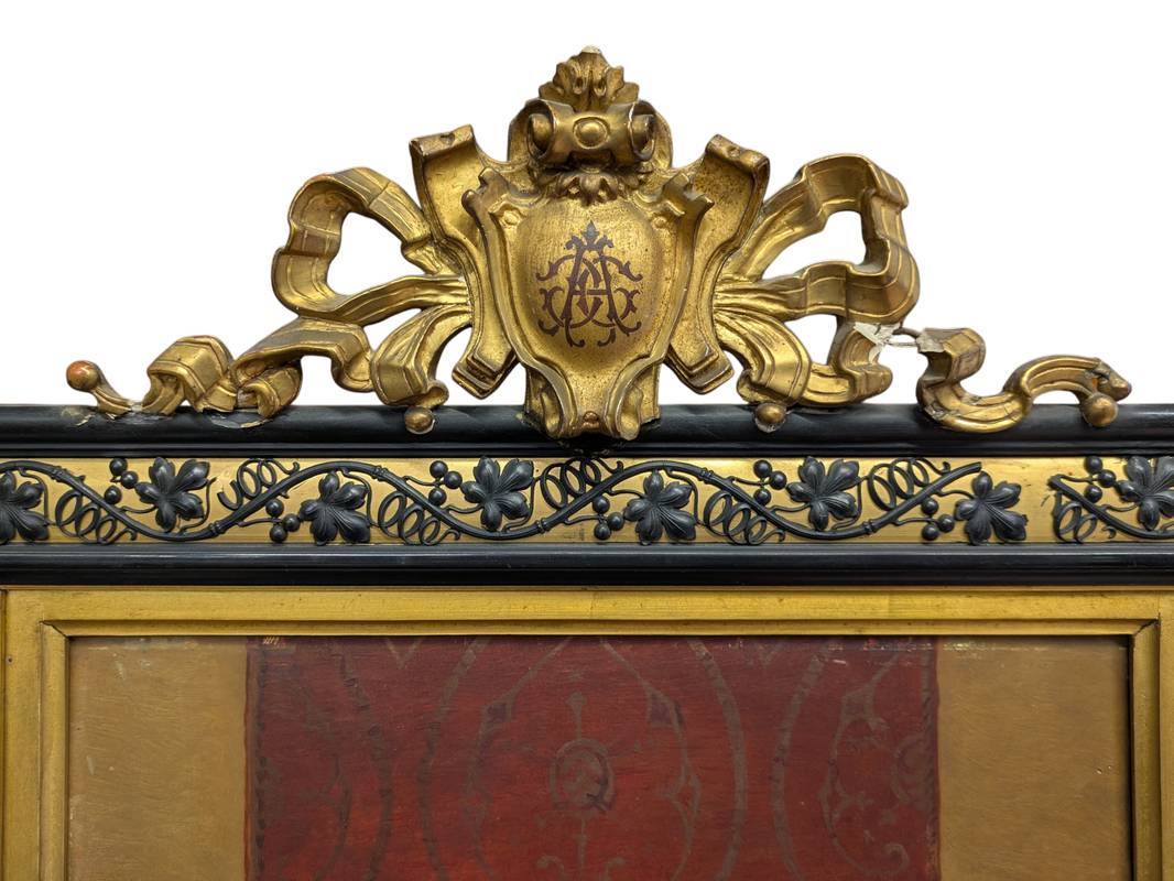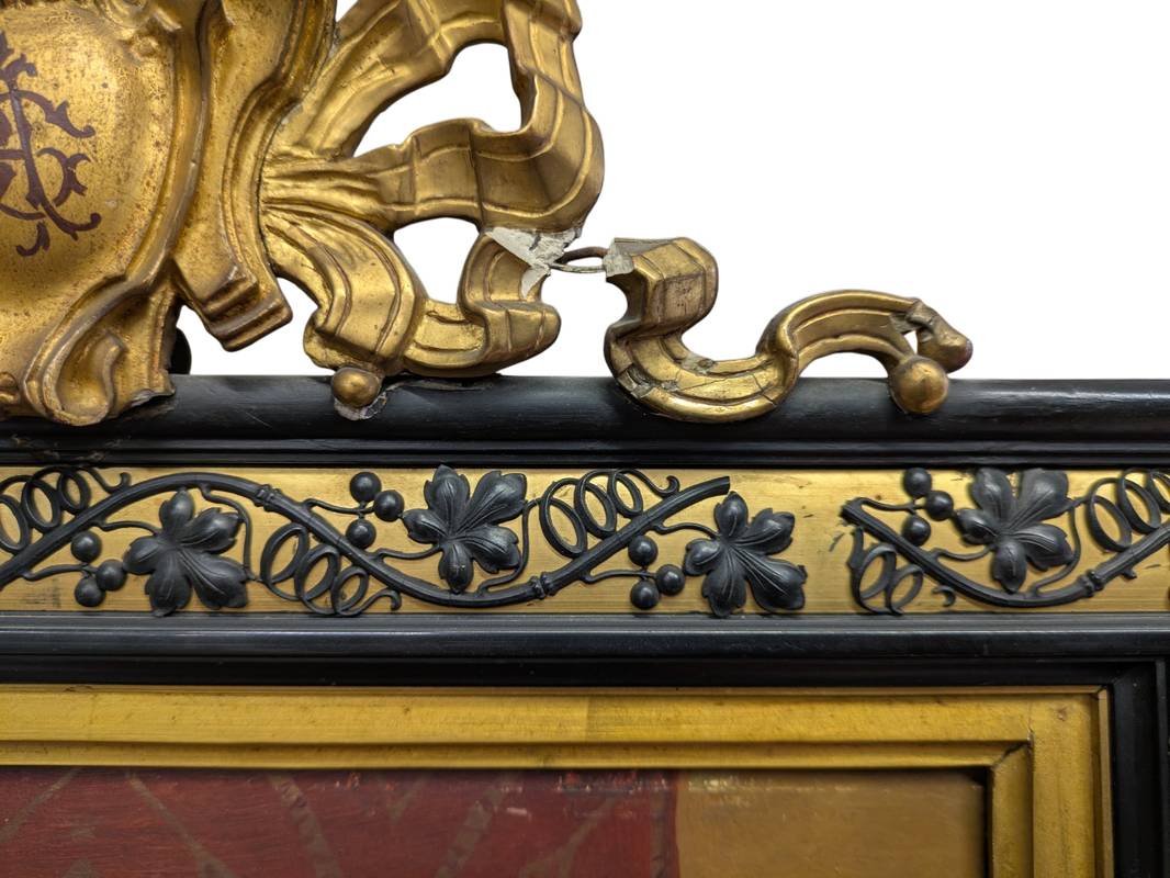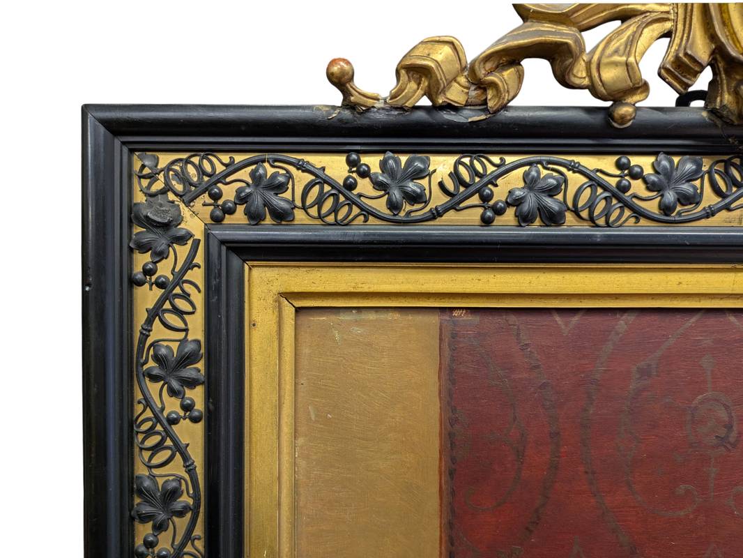 In ottime condizioni conservative come da fotografie entro importante cornice ornata con decoro a foglie di vite e cimasa superiore con stemma monogrammato e dorato.