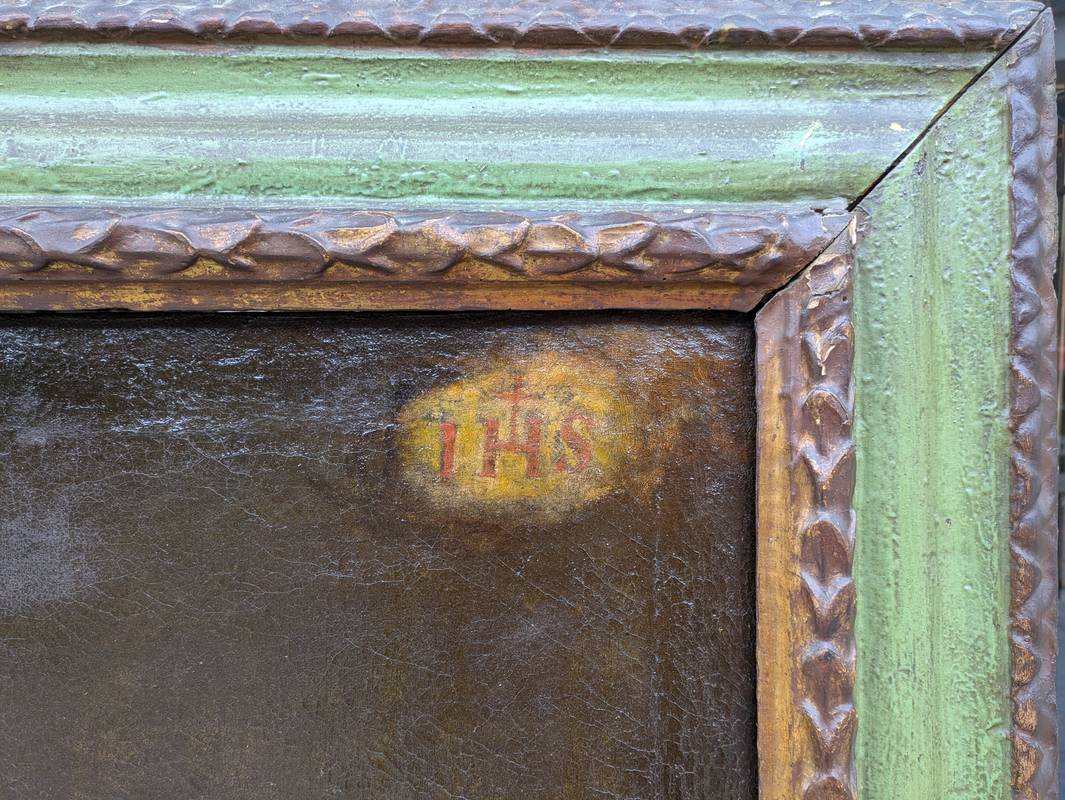 Nell’angolo in angolo a destra appare il Cristogramma IHS, abbreviazione del nome di Gesù e attributo del santo nell’arte.