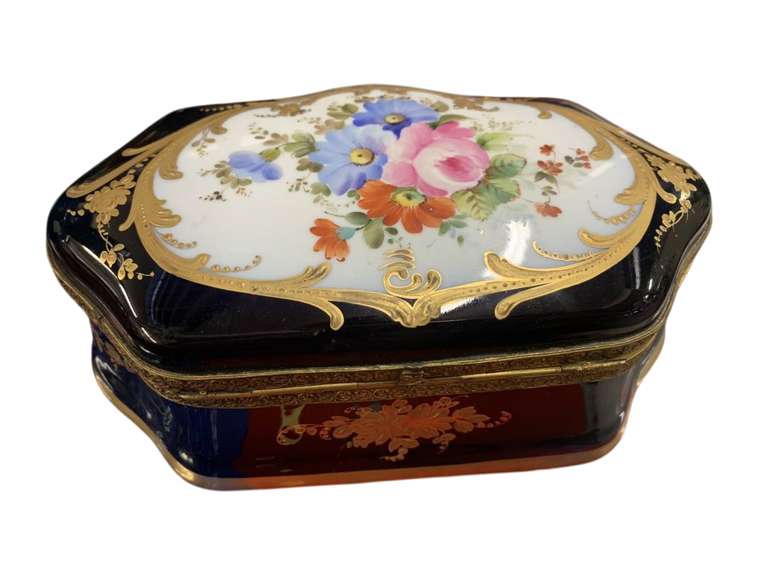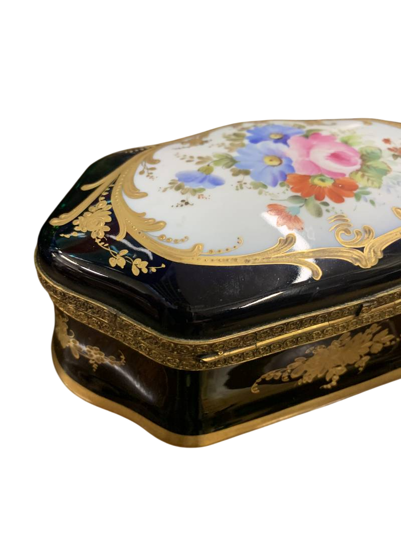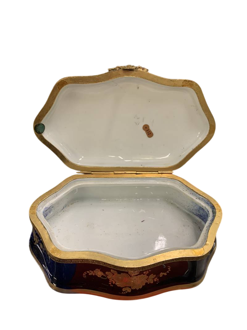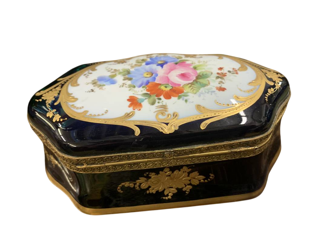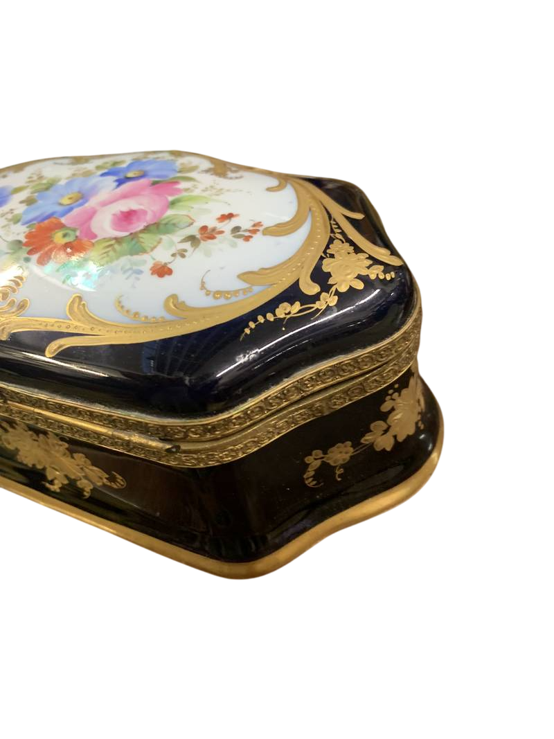 Scatola scrigno in porcellana blu cobalto e oro decori floreali