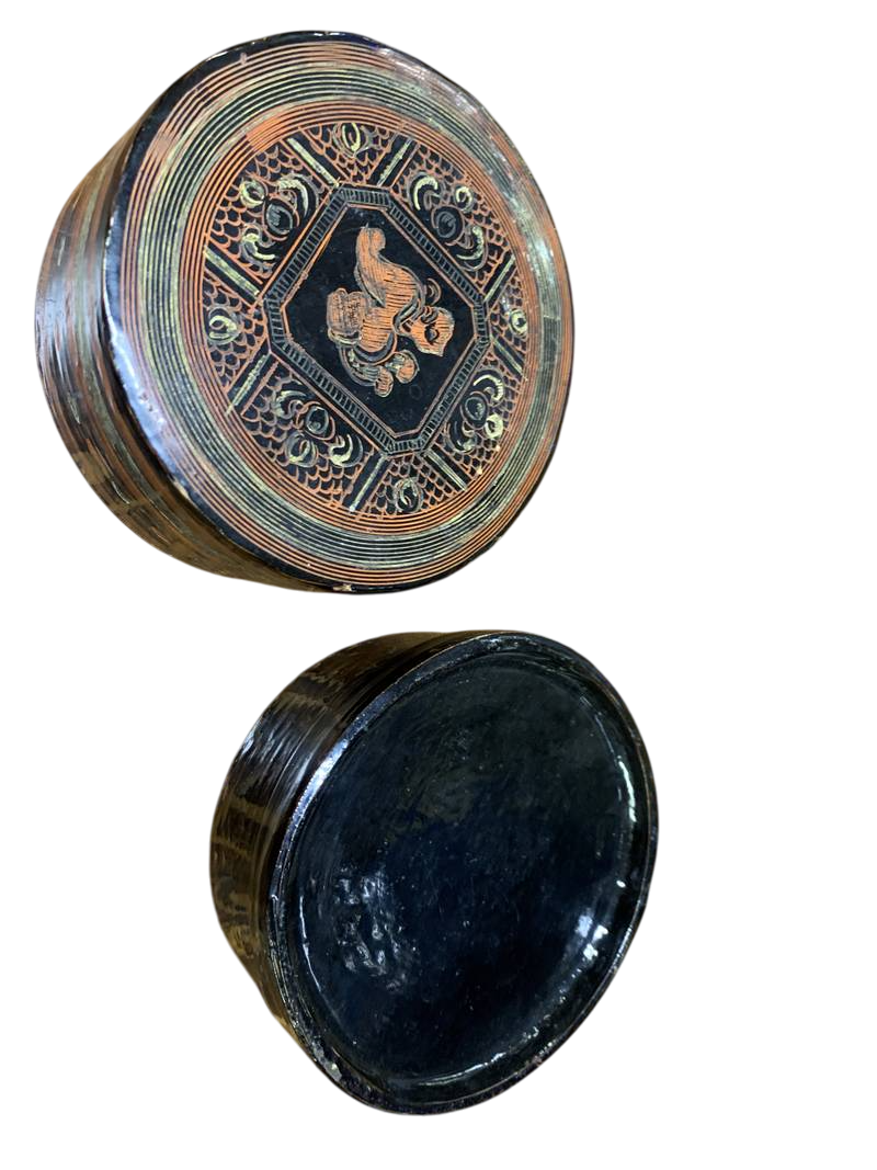 ORIGINALE scatola di betel birmana d’epoca, in legno laccato conosciuta localmente come “Kun-It”. lacca nera con figure
