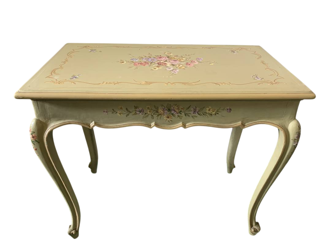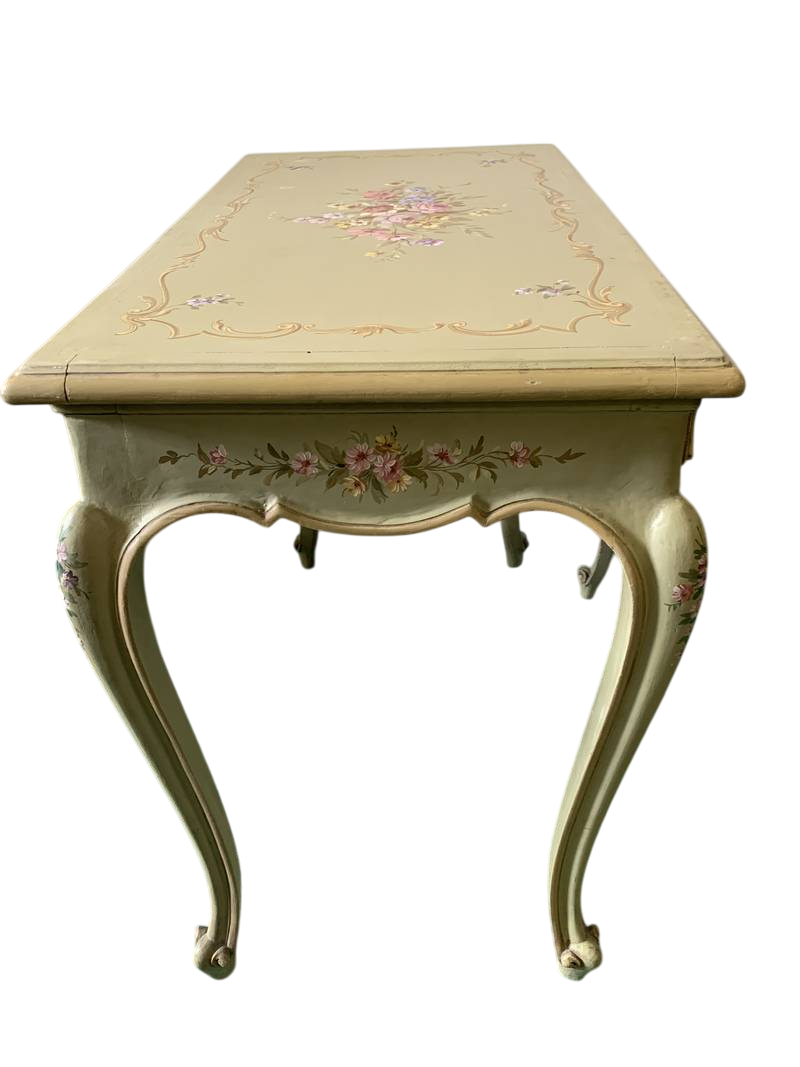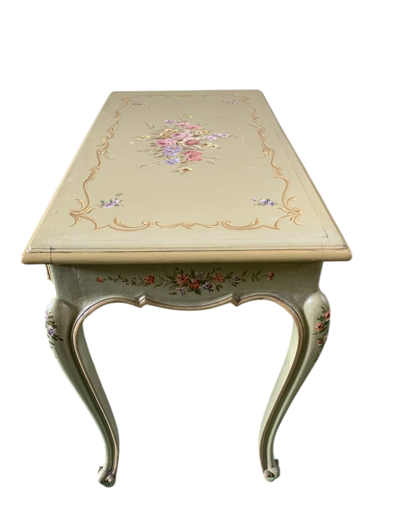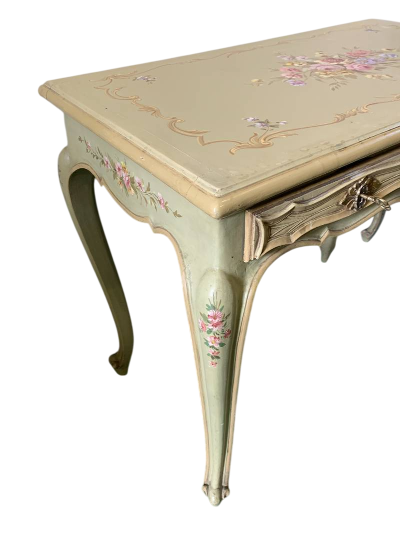 Scrivania piccolo scrittoio Veneziano laccato e dipinto , due cassettini lacca verde pastello e color crema ,dipinto e gambe a sciabola .