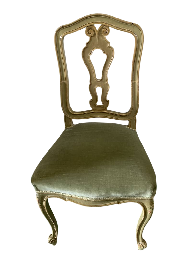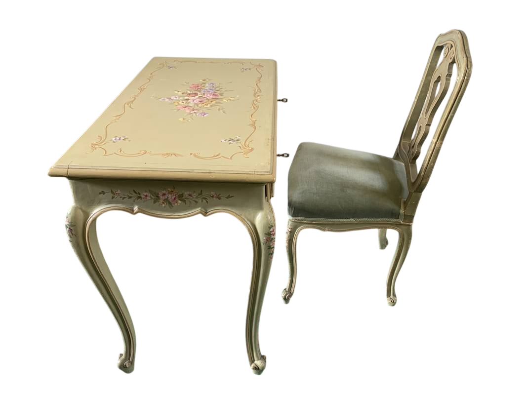 Scrivania piccolo scrittoio Veneziano laccato e dipinto con poltroncina