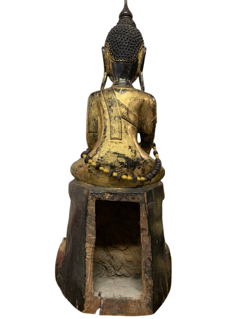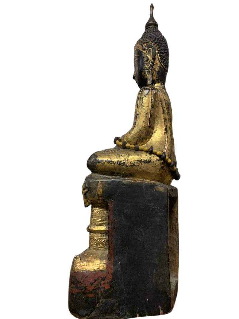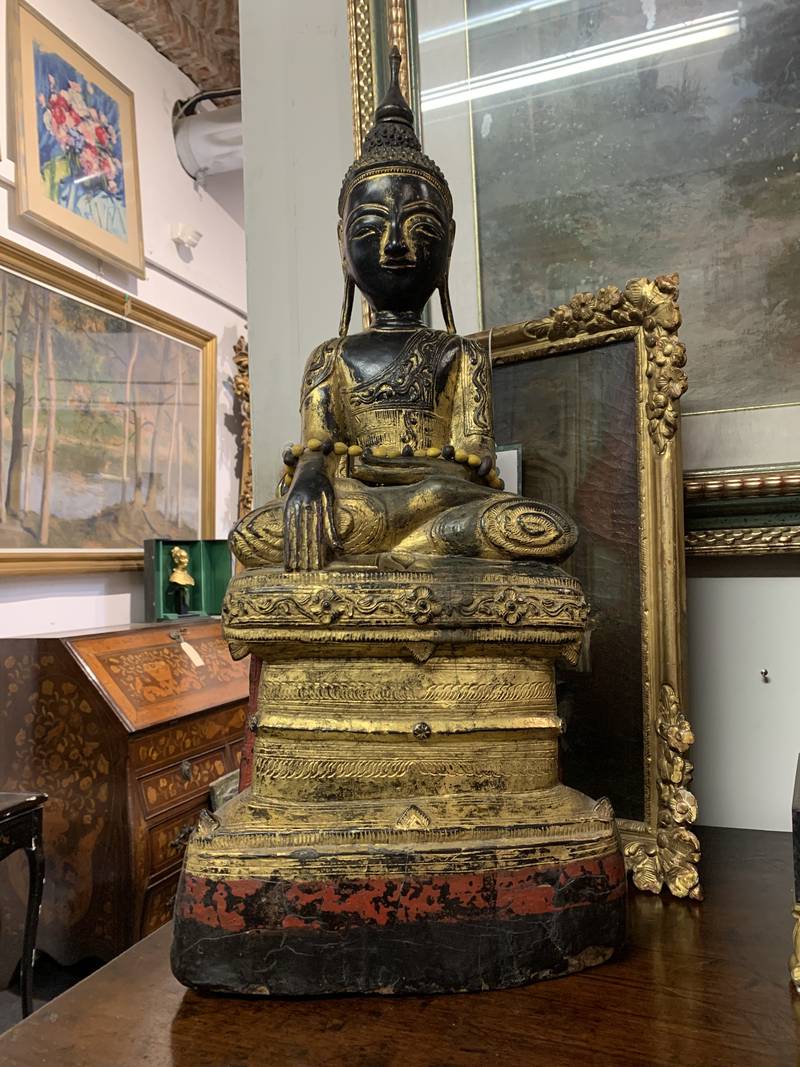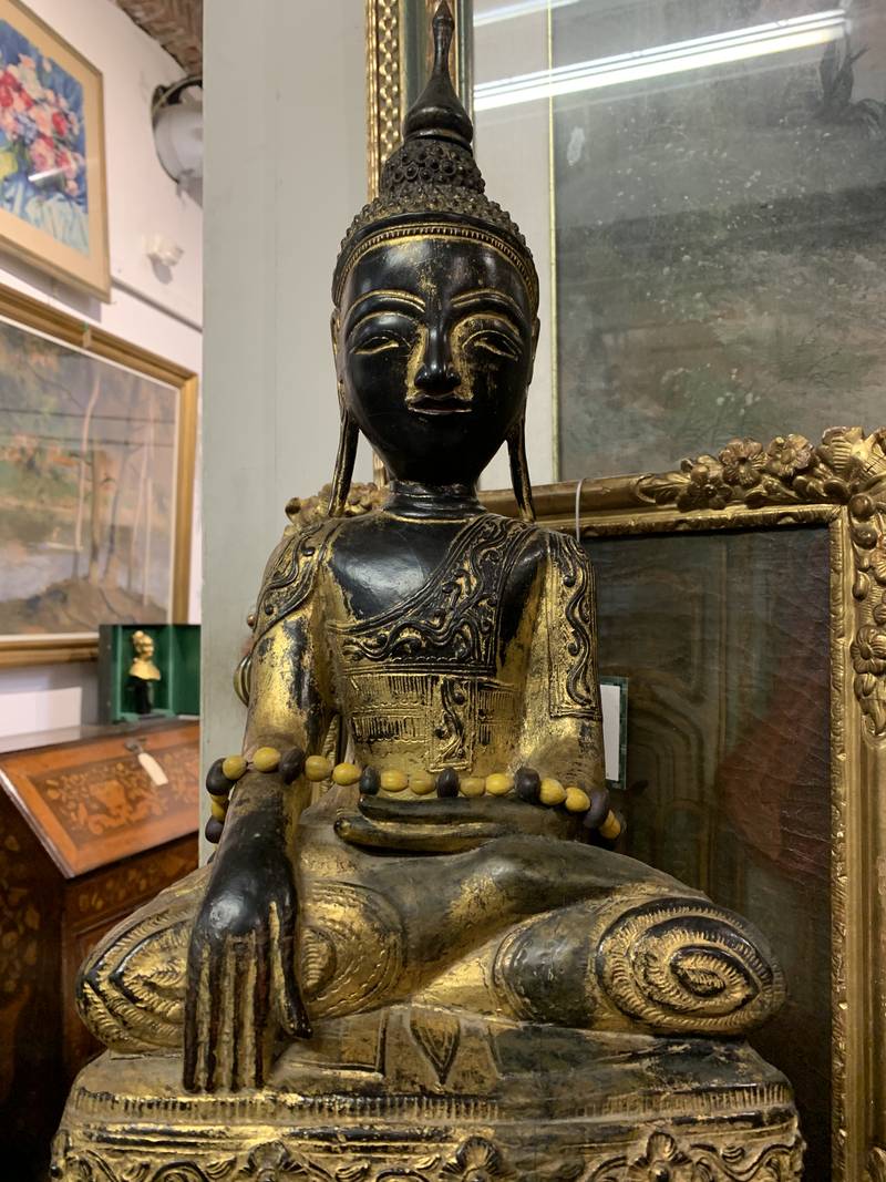 Scultura orientale lignea Budda orientale seduto dorato in patina Birmania epoca XIX secolo