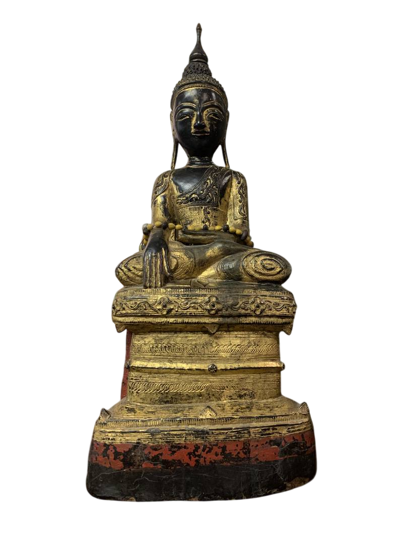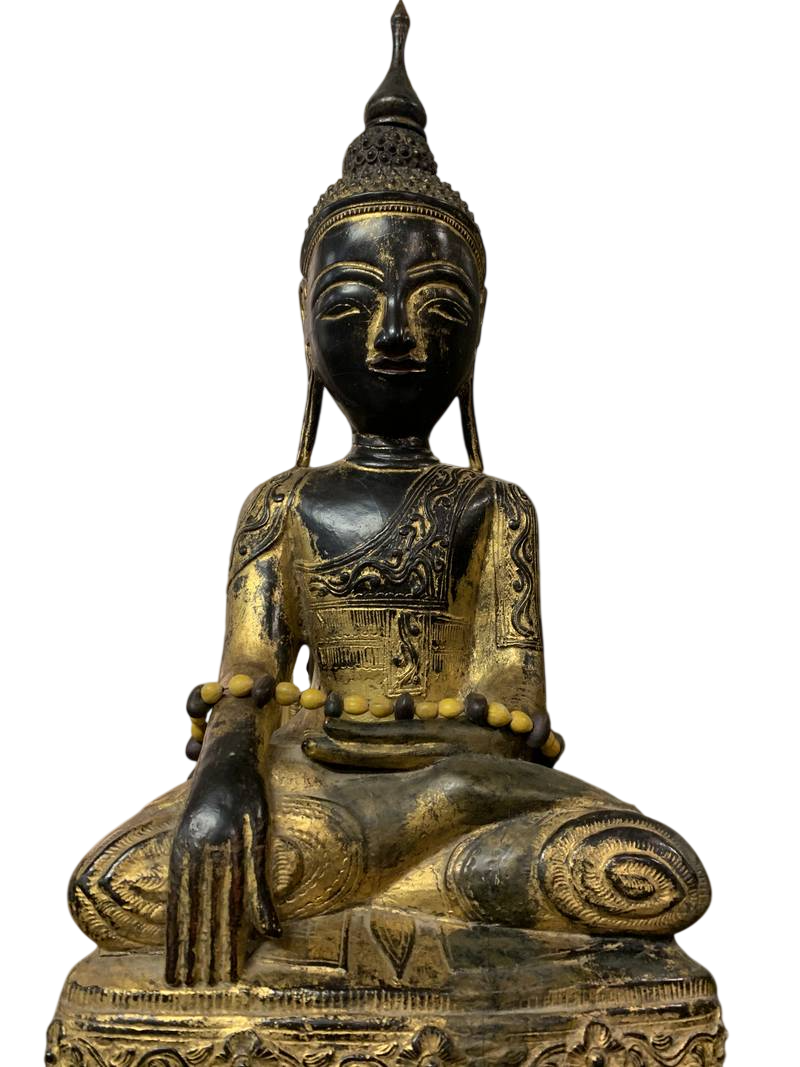 Scultura orientale lignea Budda orientale seduto dorato in patina Birmania