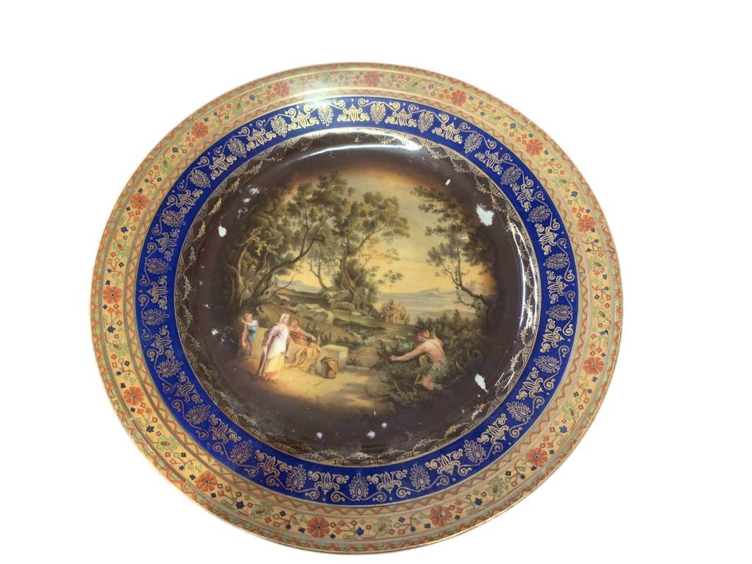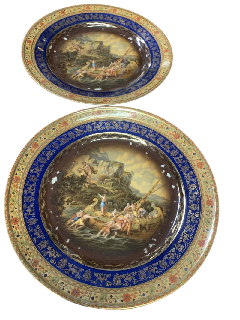 set di 14 piatti con scene allegoriche porcellana Royal Vienna con bordi blu cobalto e oro
