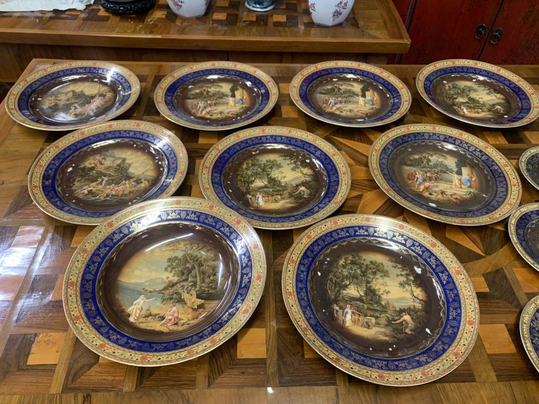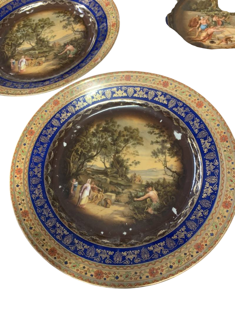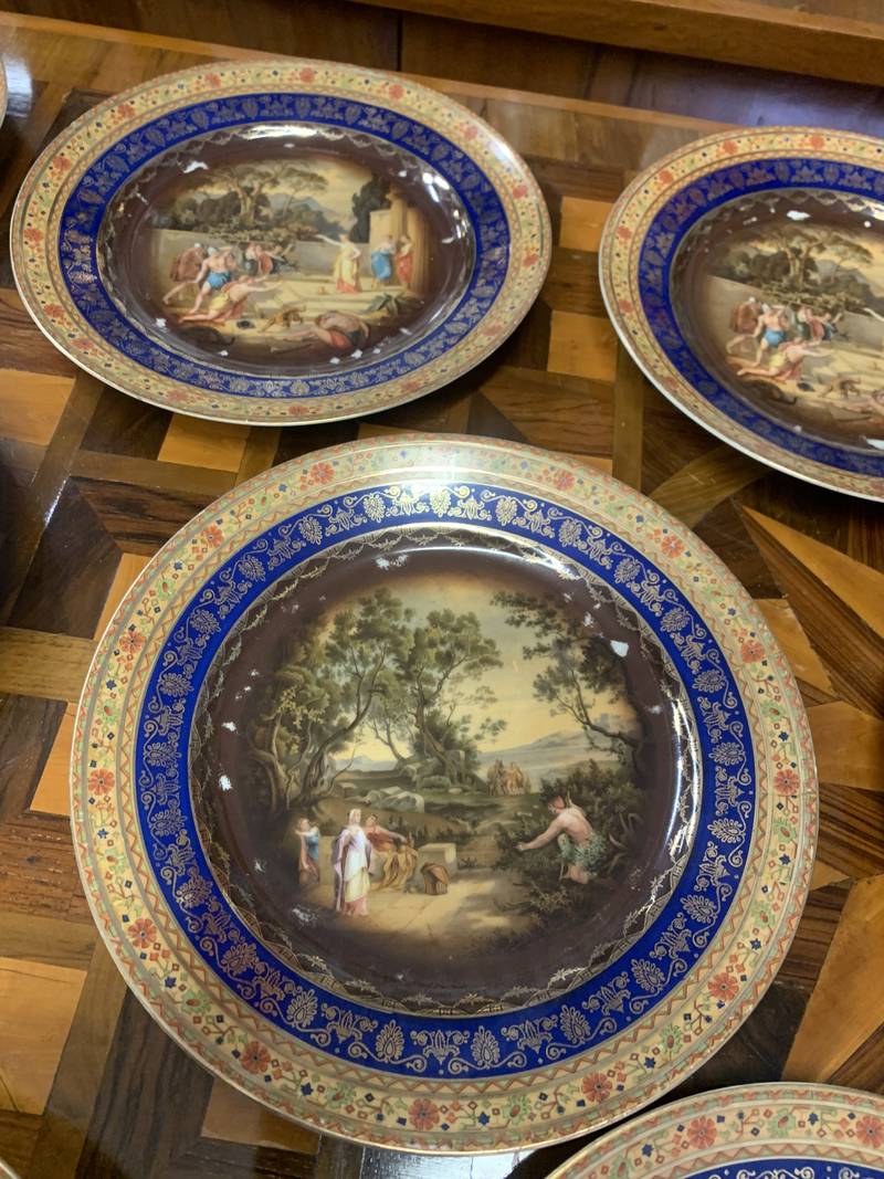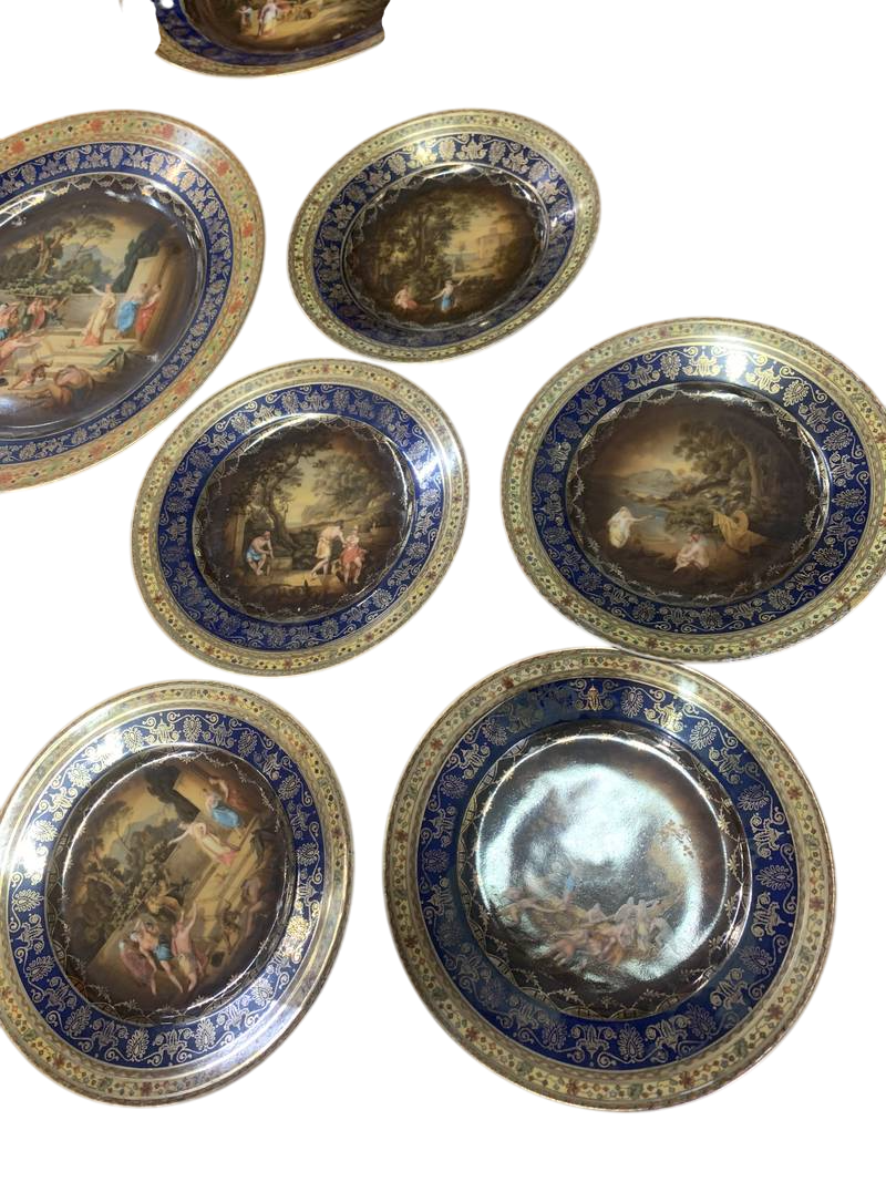 Serie di 14 piatti porcellane con bordi blu cobalto oro scene allegoriche porcellana Royal Vienna