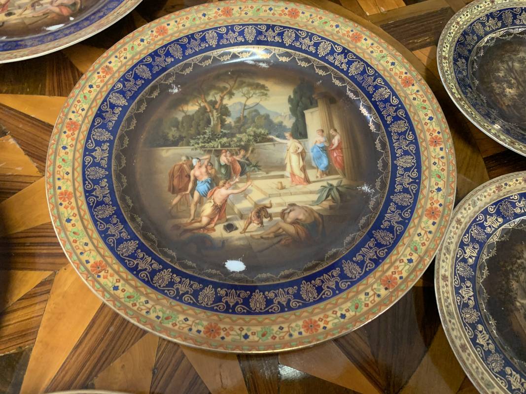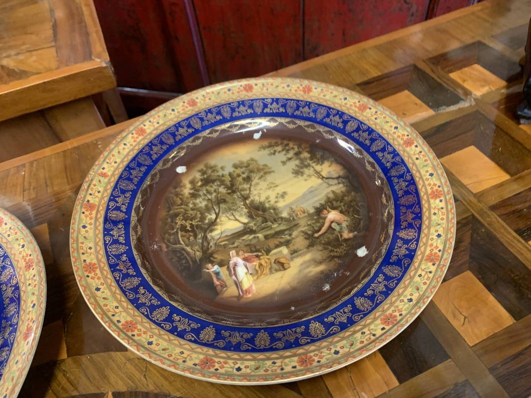 piatti e vassoi in porcellana decorati con scene bucoliche e bordi elaborati.