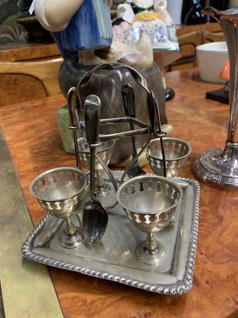 È composto da un vassoio, un supporto centrale con manico, e quattro coppe per uova con cucchiani