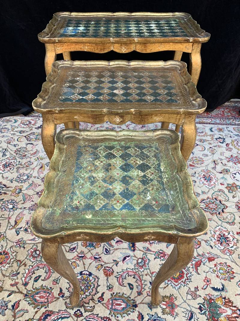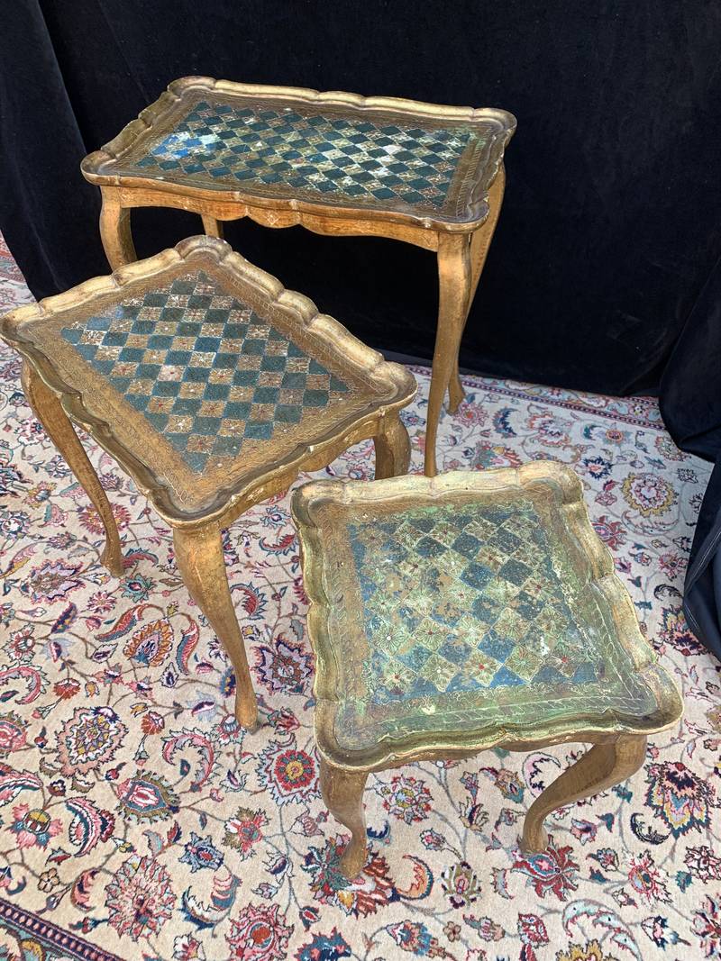 Set di tre tavolini a cicogna in legno dorato e laccato XX secolo Fiorentini