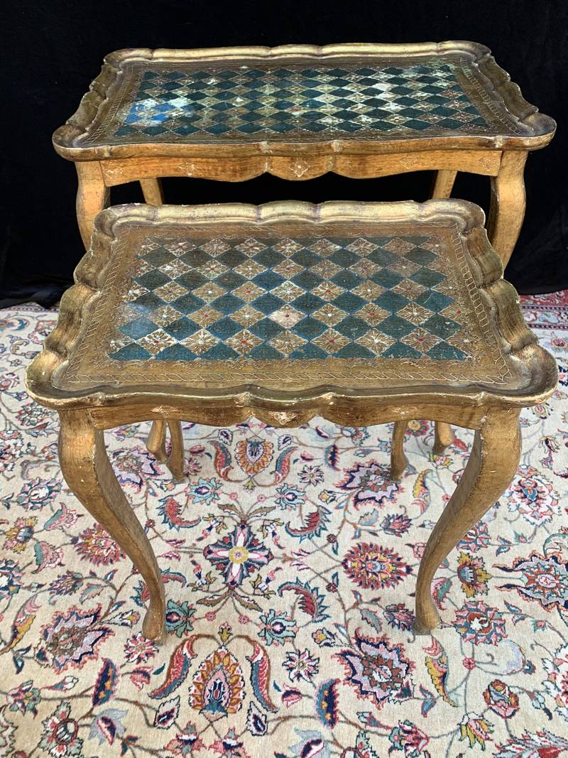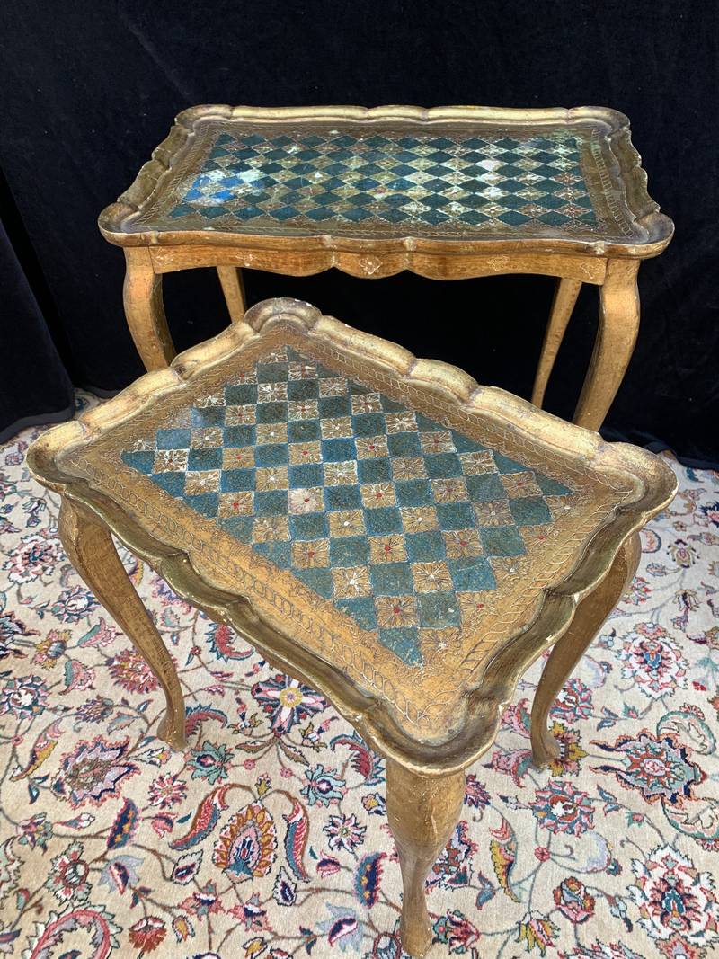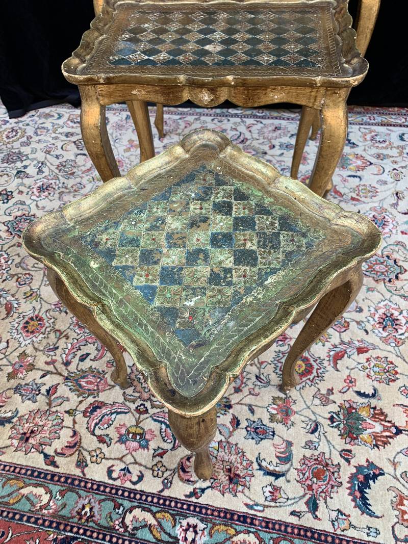 set di tre tavolini ad incastro è realizzato in legno dorato e presenta un caratteristico piano decorato a scacchi