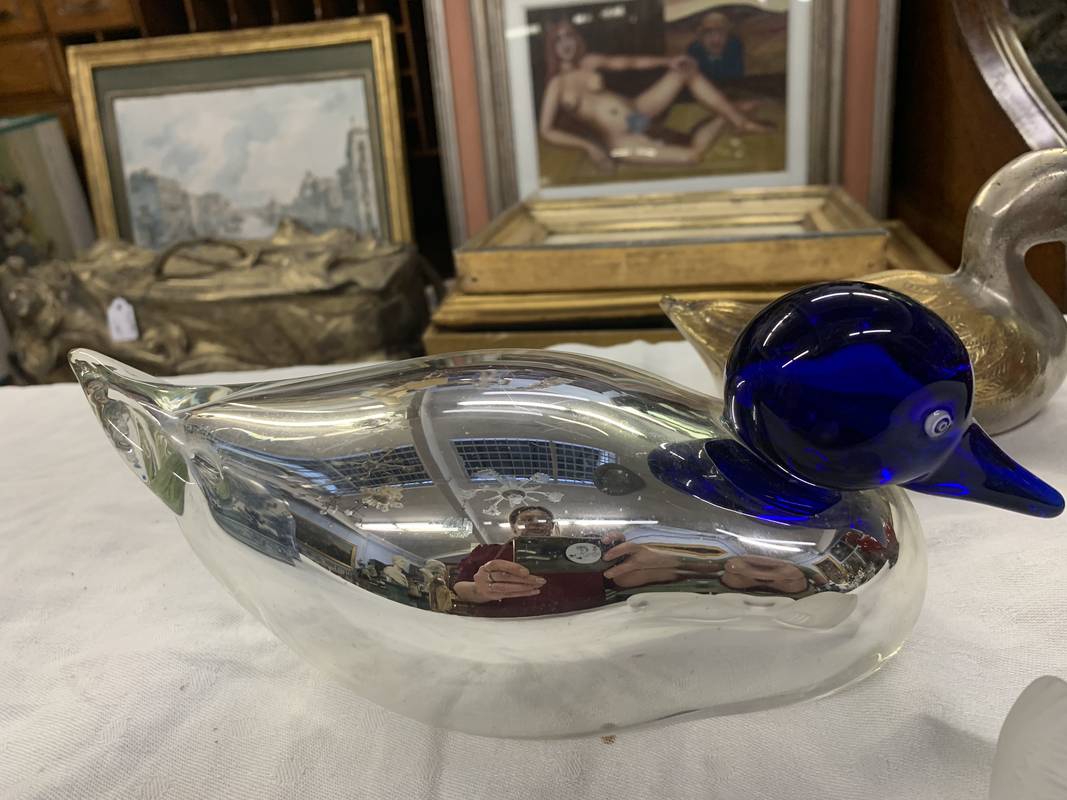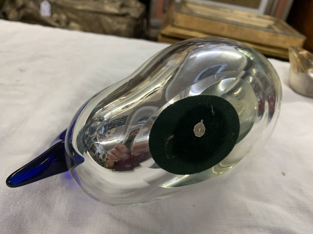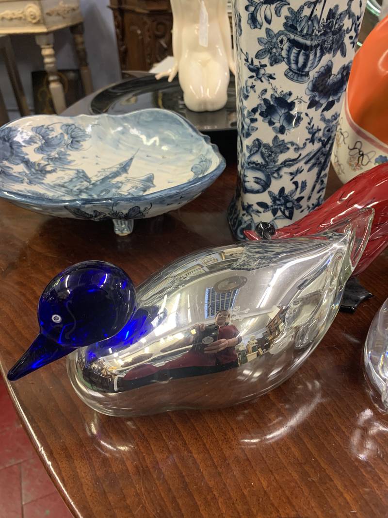Vetro di Murano soffiato a mano, caratterizzato da un corpo riflettente e una testa di colore blu intenso.