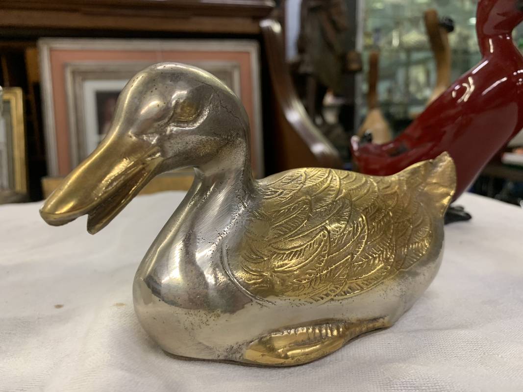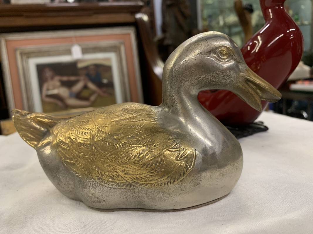 statuina di anatra , realizzata in metallo argentato con inserti o dettagli in ottone cesellato.risalente agli anni ’70.