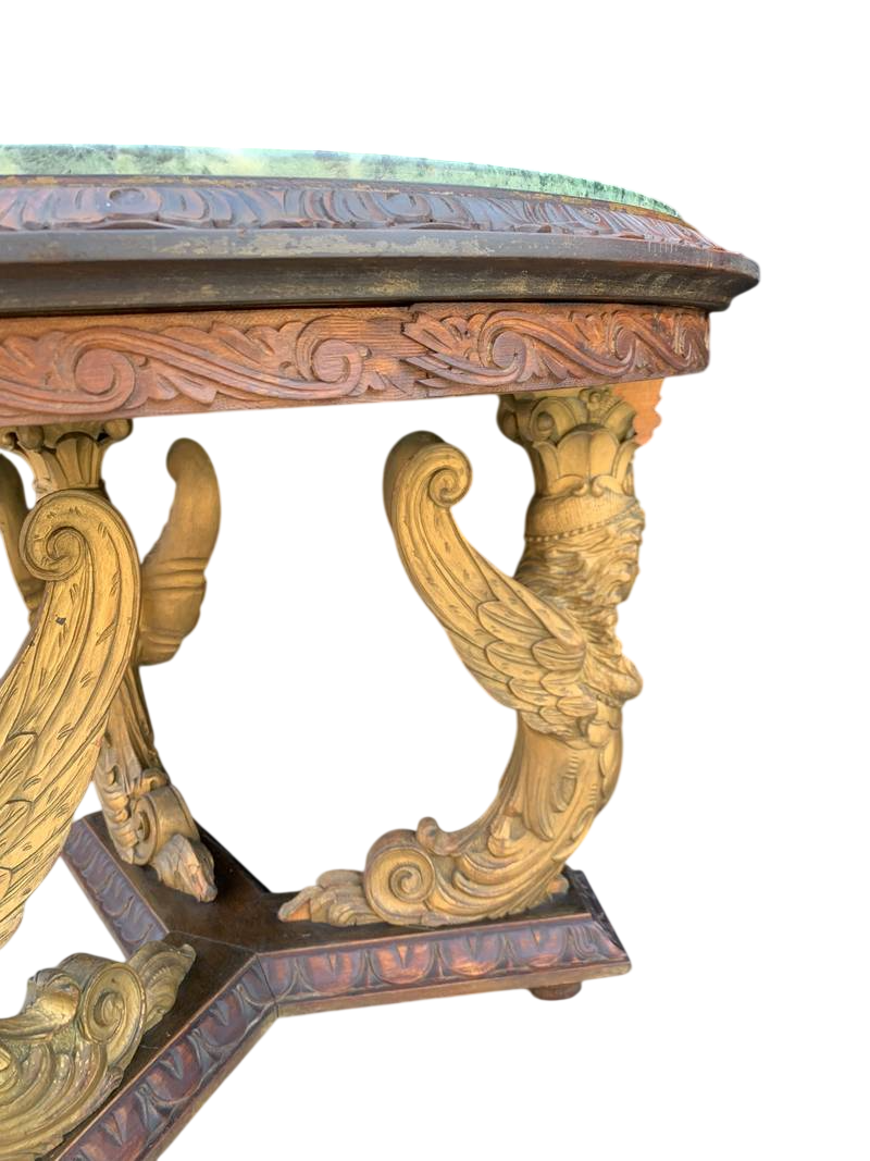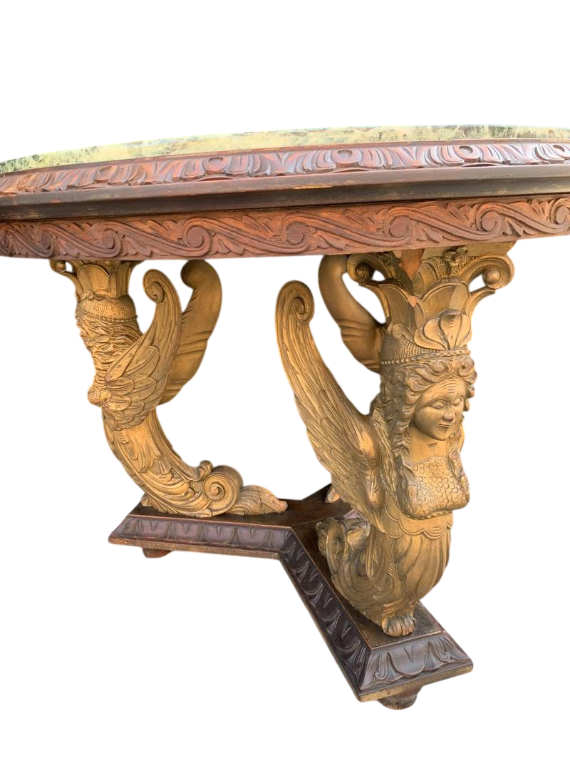 Tavolino Art Deco’ marmo verde cariatidi sfingi alate e dorate anni 30 40
