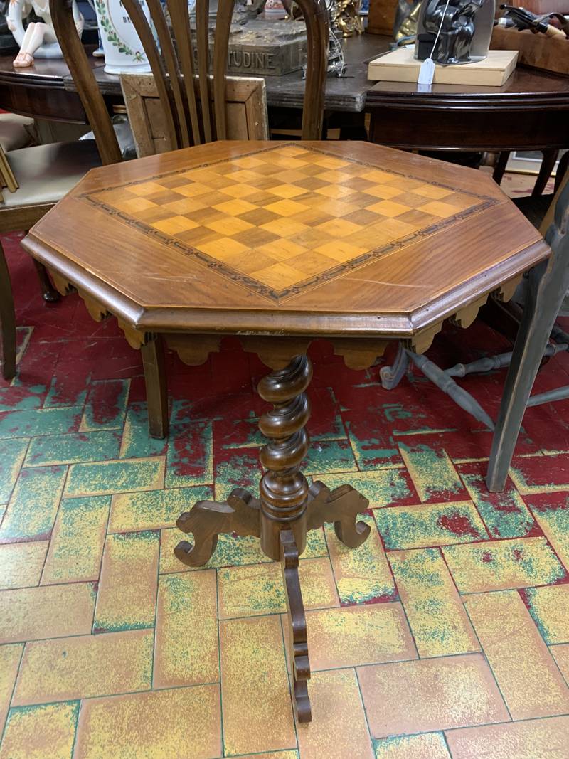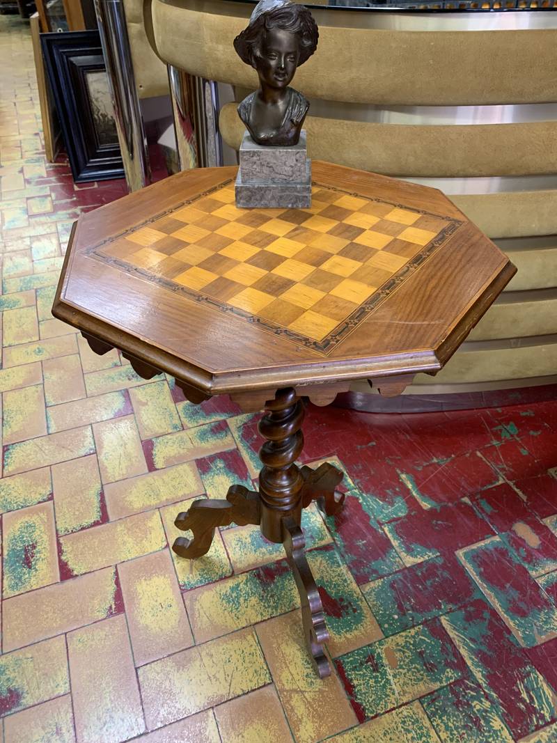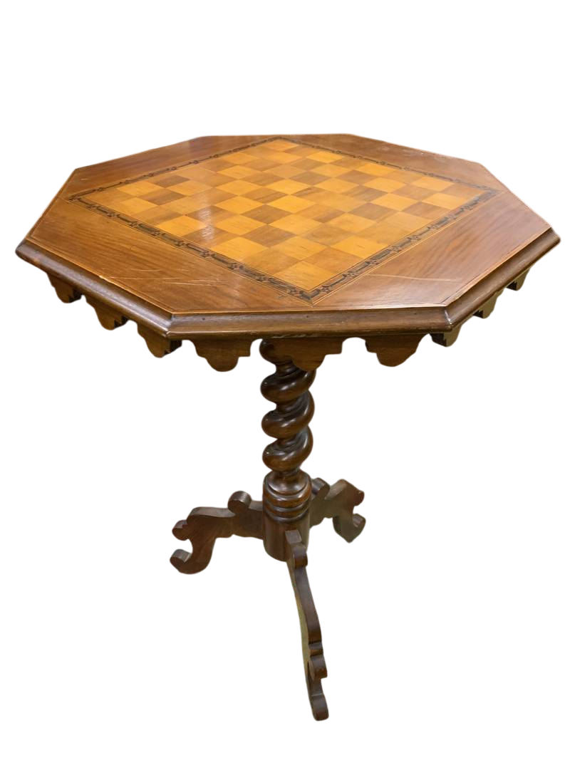 Tavolino da gioco con piano intarsiato con scacchiera base a torchon dei primi del 900
